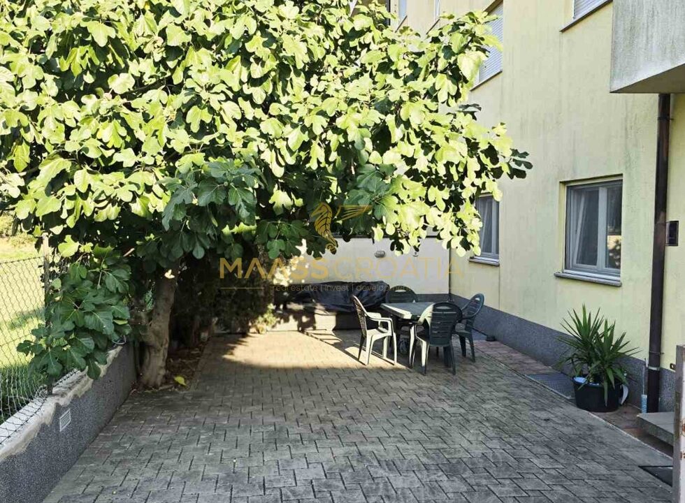 Die Wohnung verfügt über zwei Schlafzimmer, ein geräumiges Wohnzimmer mit Essbereich und Küche, ein Badezimmer und eine überdachte Terrasse mit Zugang zum 50 m² großen, schön angelegten Garten.