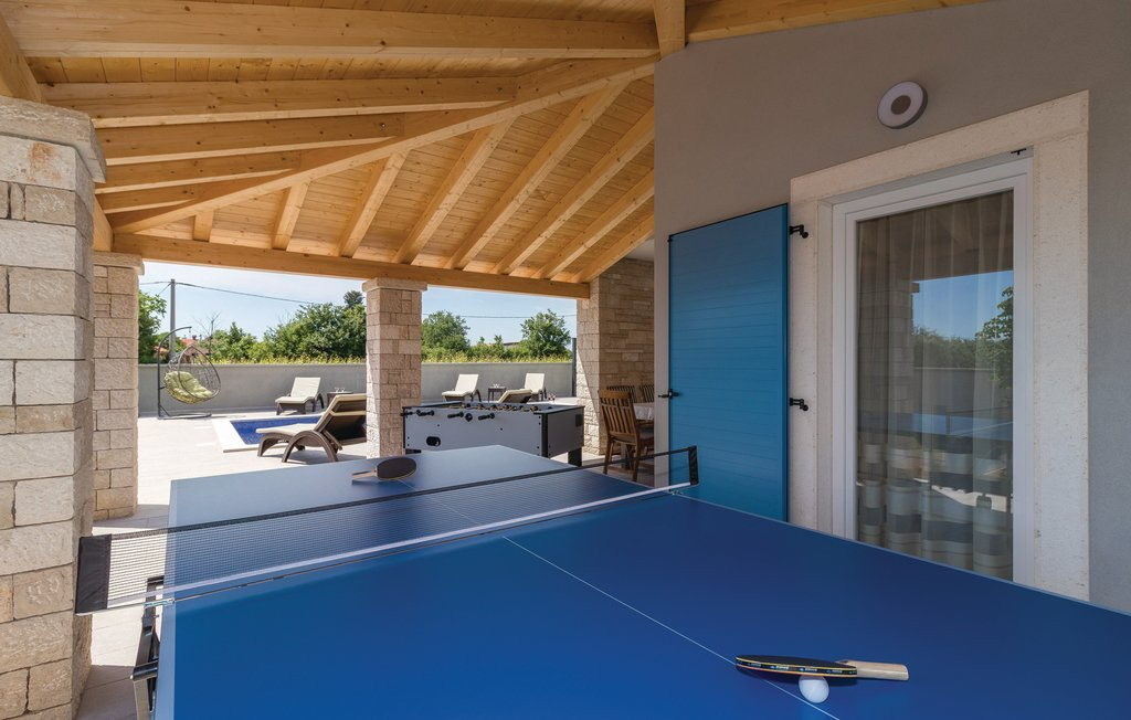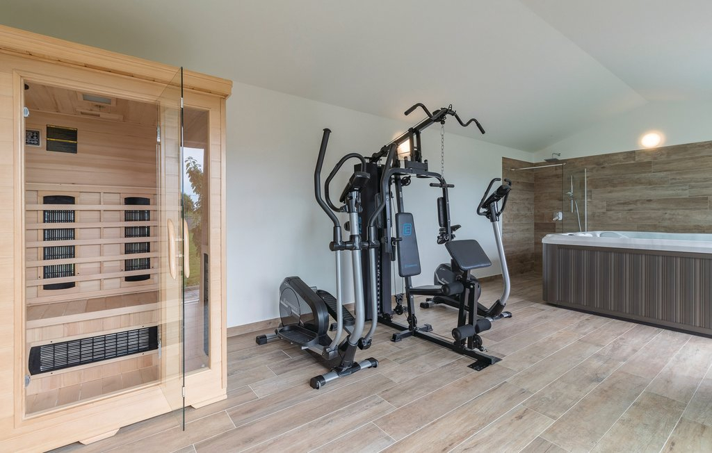 Außerdem gibt es einen eingebauten Fitnessraum, eine Sauna, einen Whirlpool und in der Küche einen Brotofen.