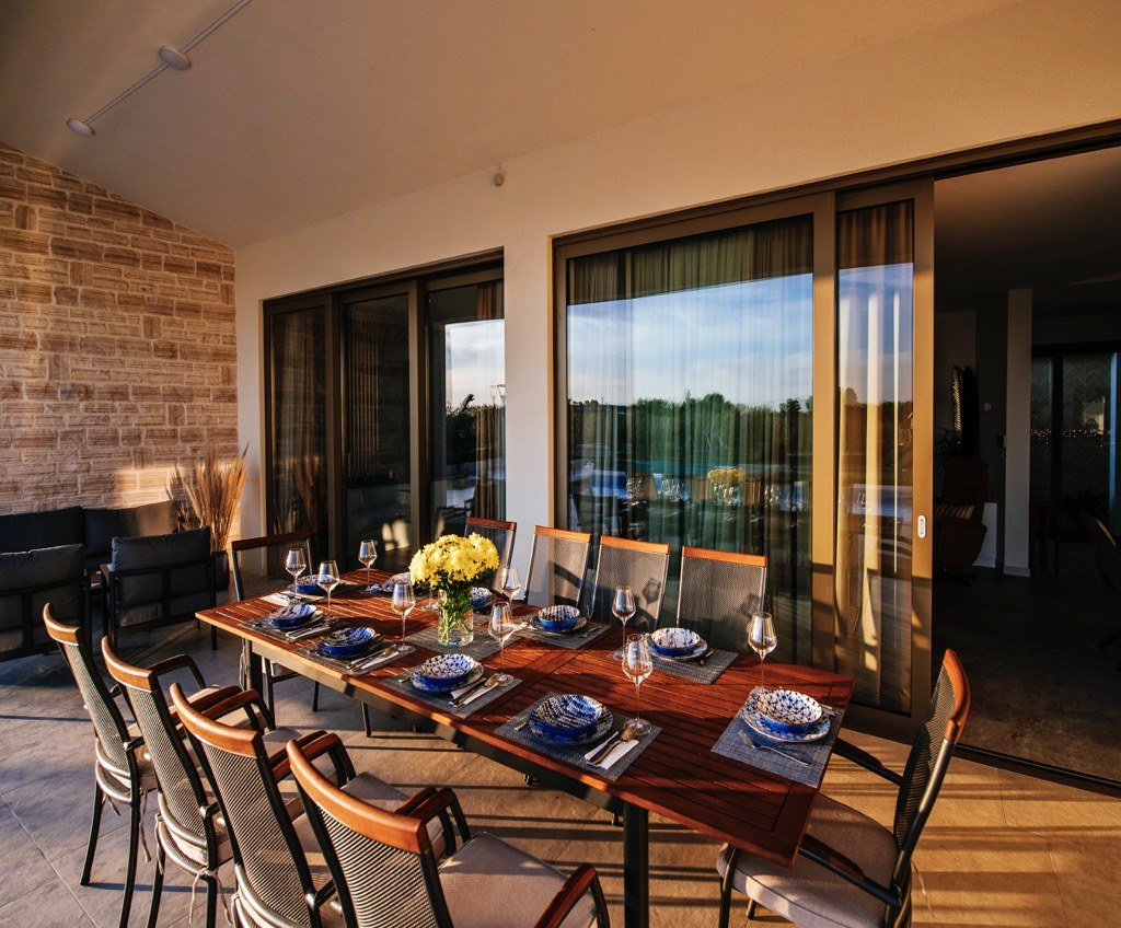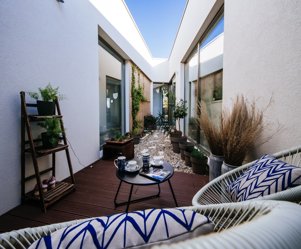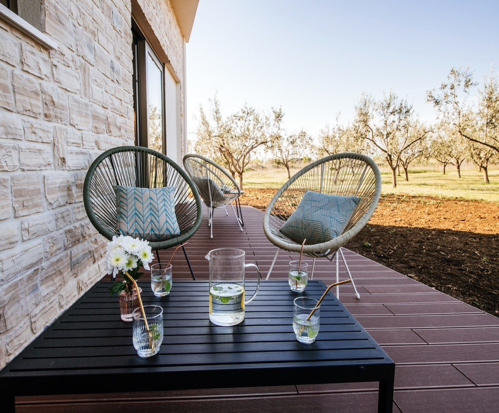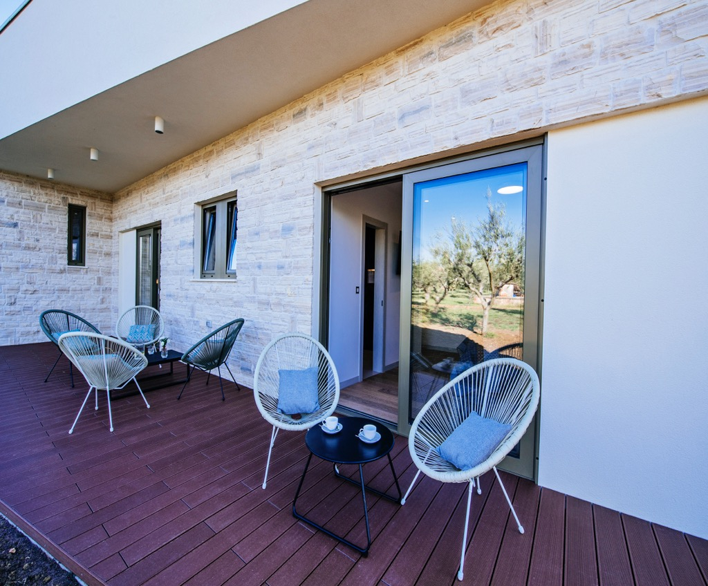 Die großzügige Terrasse, die als Lounge-Bereich dient, ist an ein separates Gästehaus angeschlossen und fügt sich harmonisch in das Gesamtkonzept ein.