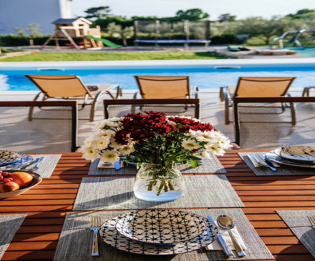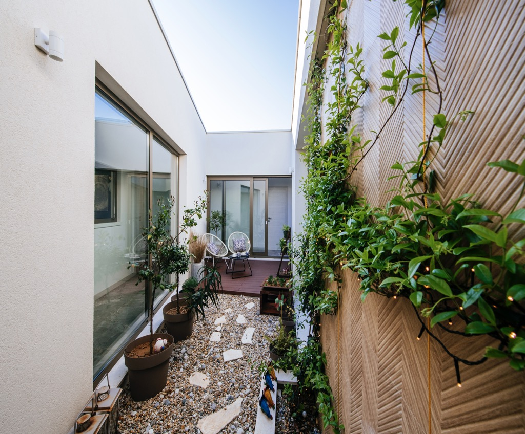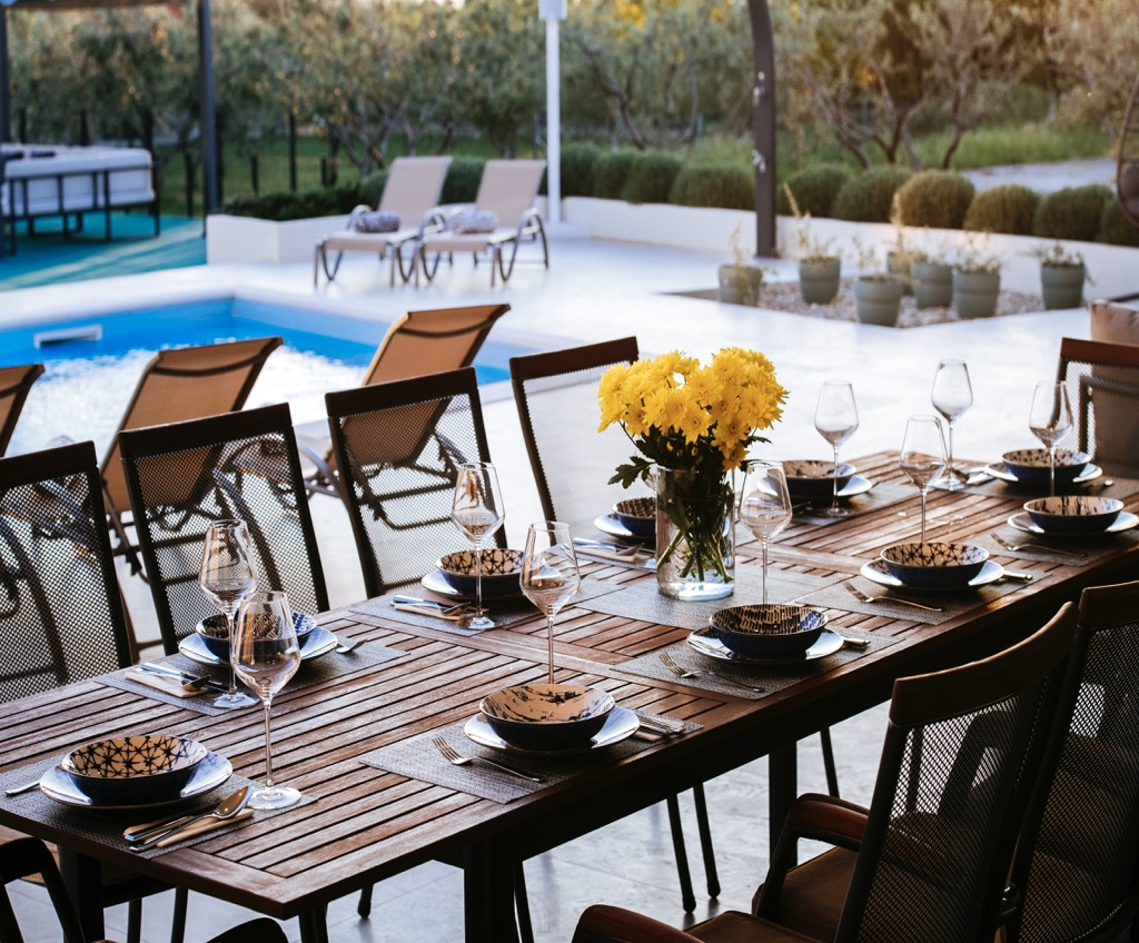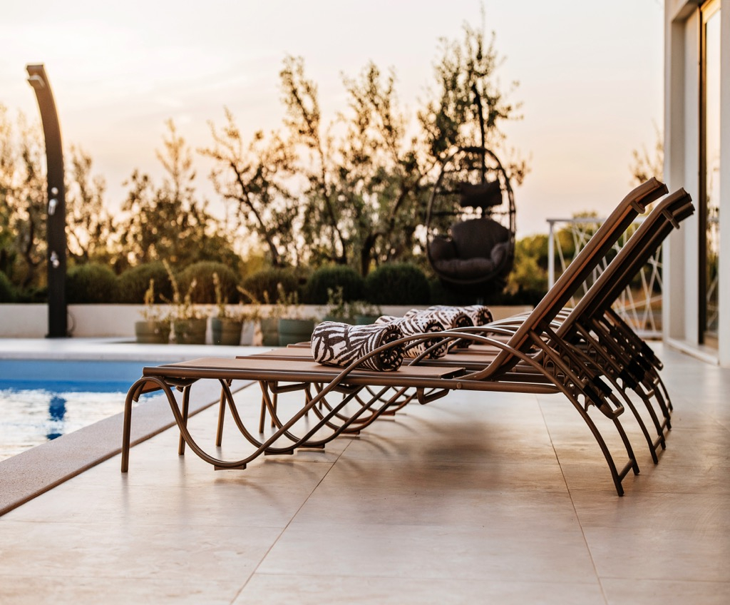 Die großzügige Terrasse, die als Lounge-Bereich dient, ist an ein separates Gästehaus angeschlossen und fügt sich harmonisch in das Gesamtkonzept ein.
