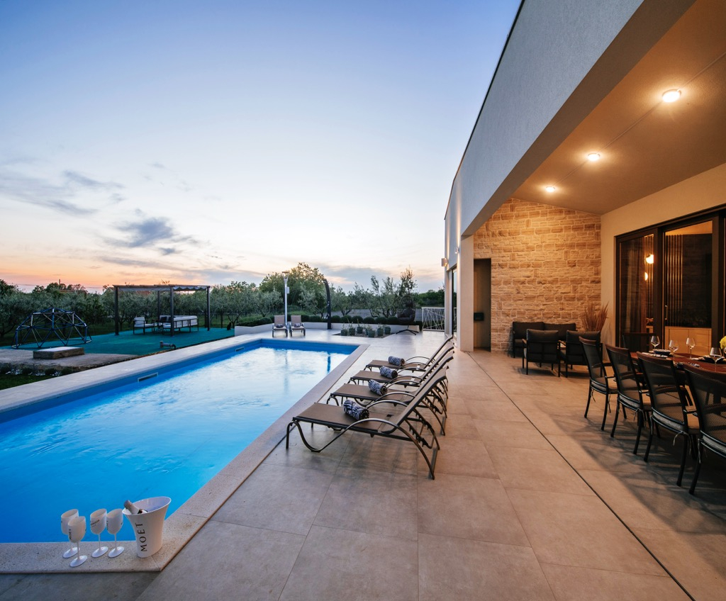 Es verfügt über einen rechteckigen Swimmingpool auf einer unregelmäßig geformten Terrasse.