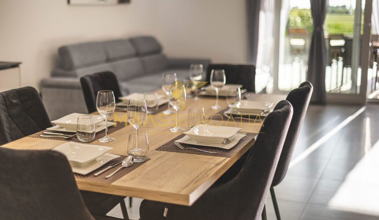 Im Obergeschoss befindet sich die zweite Wohnung, die aus einer offenen Küche, einem Esszimmer und einem Wohnzimmer sowie zwei Schlafzimmern mit angeschlossenen Badezimmern besteht. Die Schlafzimmer führen auf eine große Terrasse mit Blick auf das Meer.