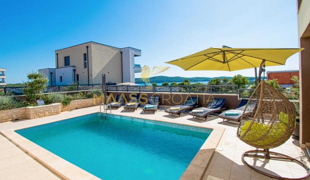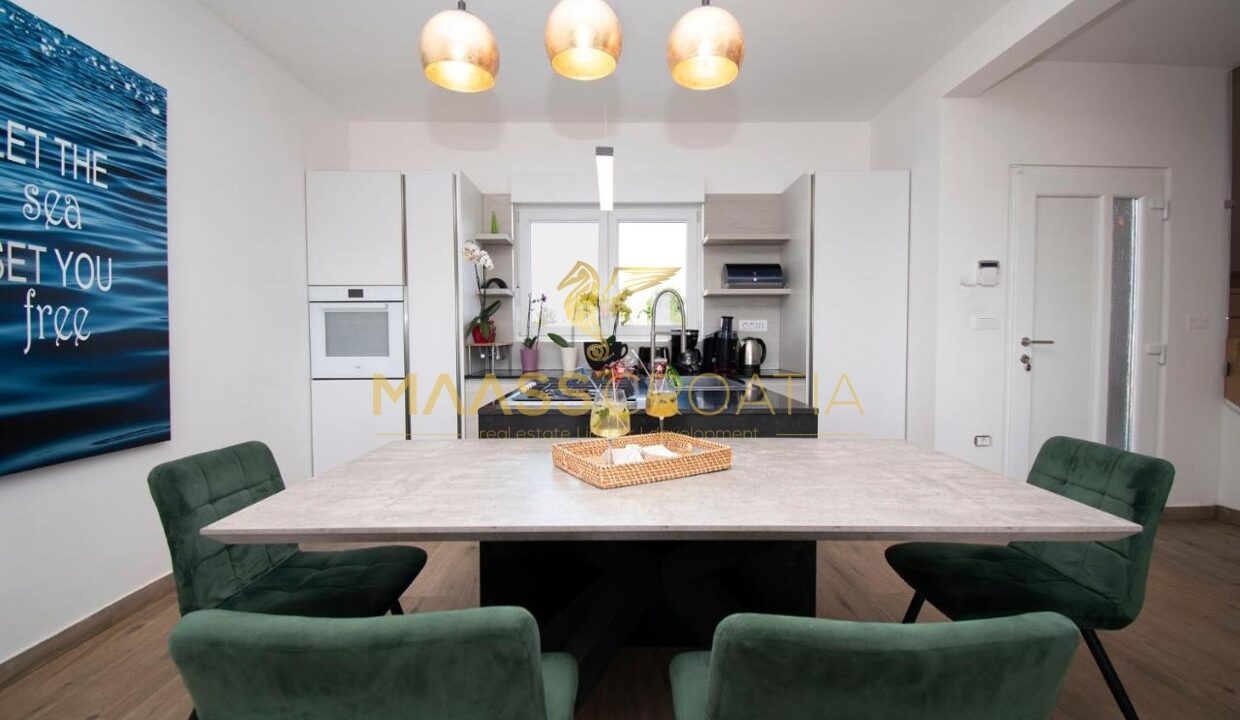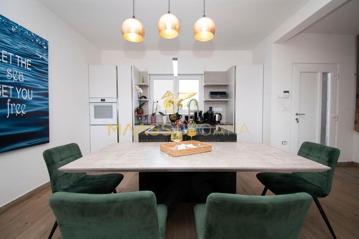 Zum Verkauf steht ein luxuriöses Einfamilienhaus mit einer Fläche von 200 m² und einem wunderschönen Meerblick, gelegen in Medulin, nur 150 Meter vom Meer und dem Strand entfernt.