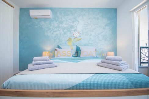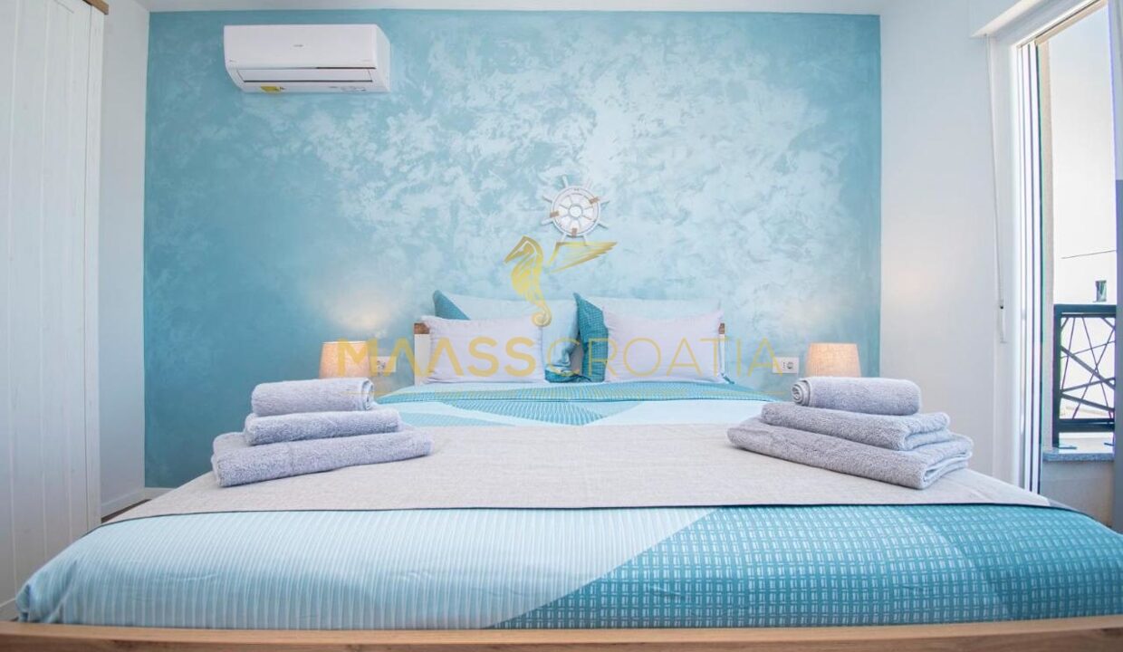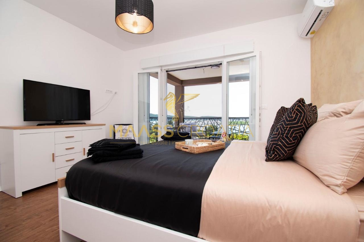 Im ersten Stock befinden sich drei Schlafzimmer, jedes mit eigenem Badezimmer und WC. Das Hauptschlafzimmer verfügt über eine Terrasse mit herrlichem Blick auf das Meer und die Halbinsel Vižula.