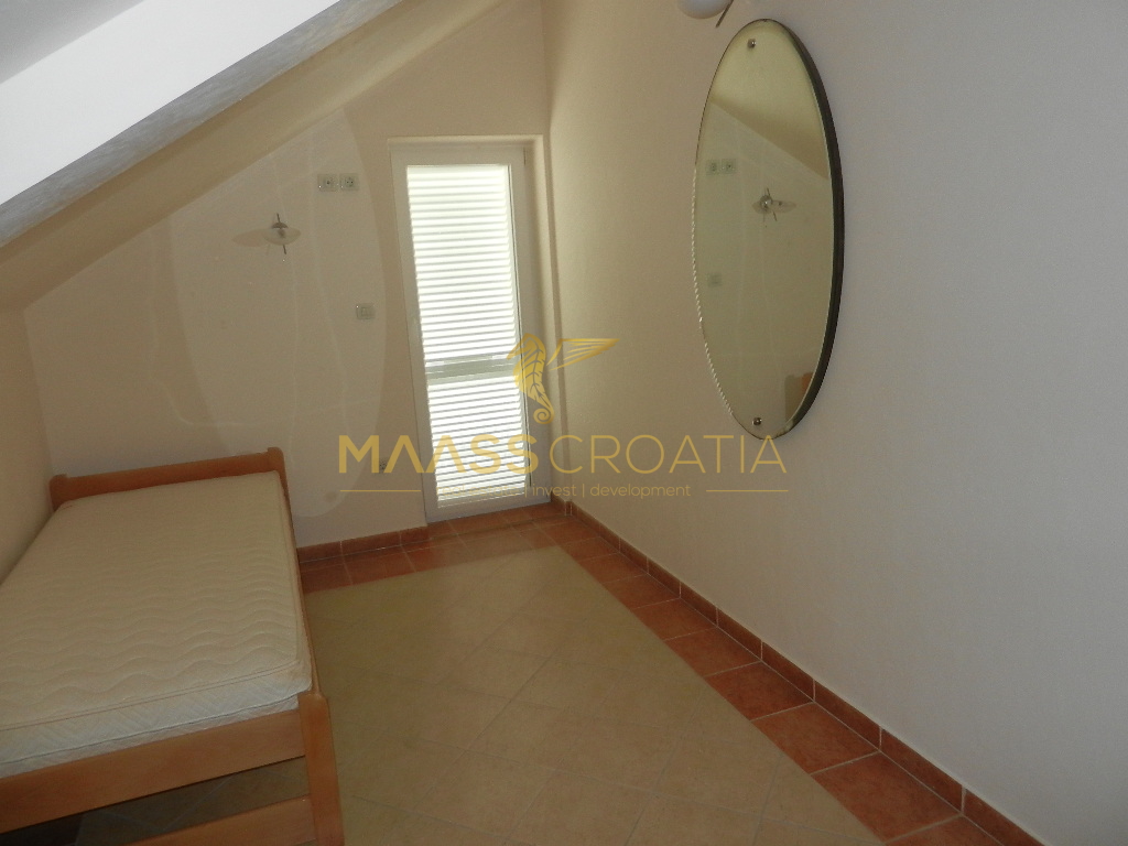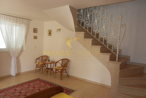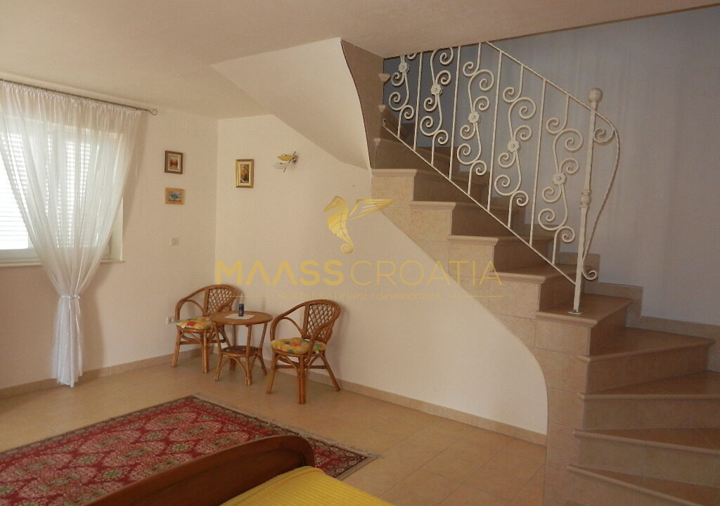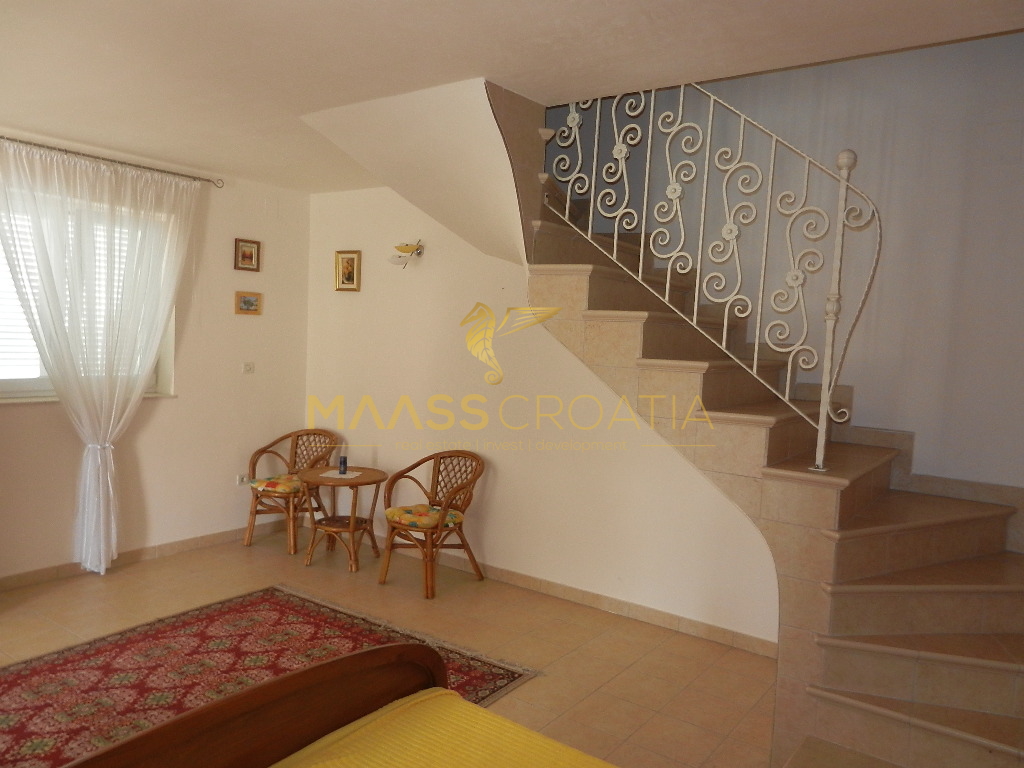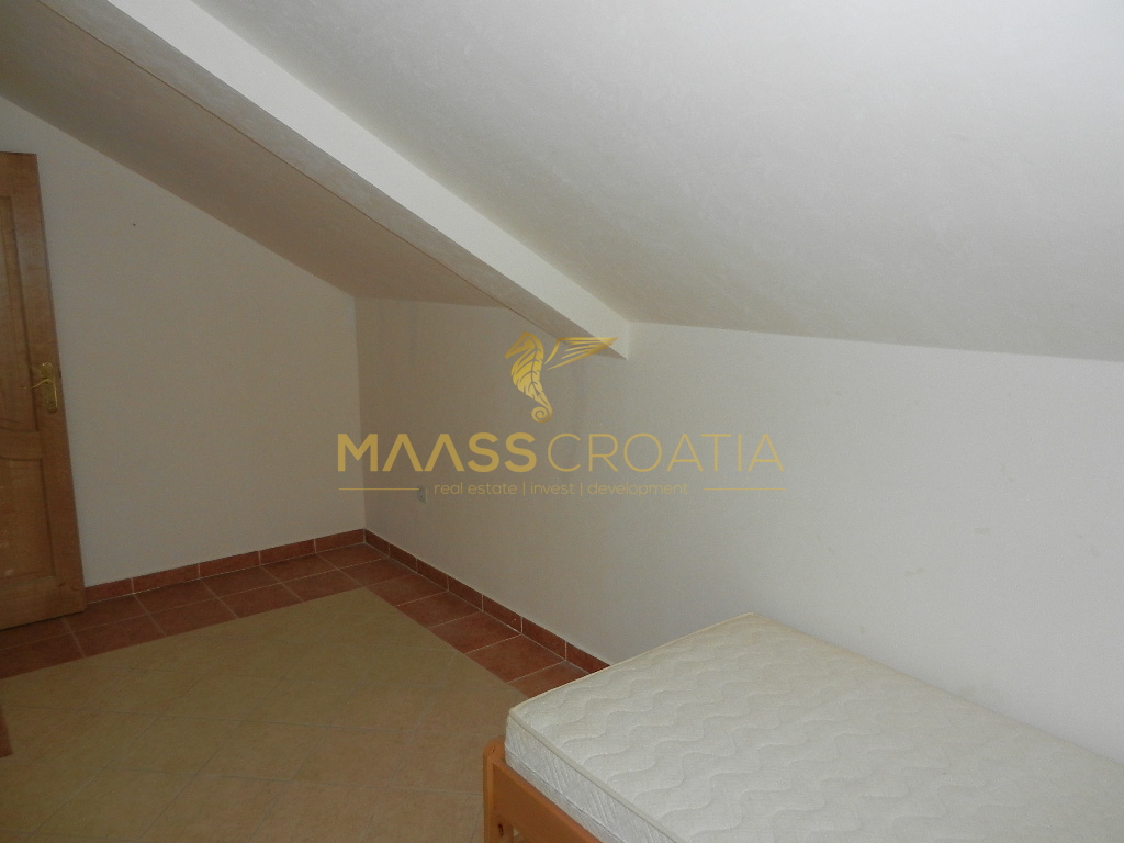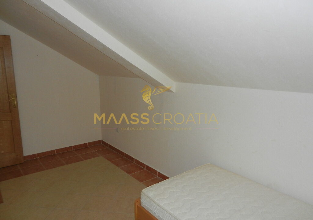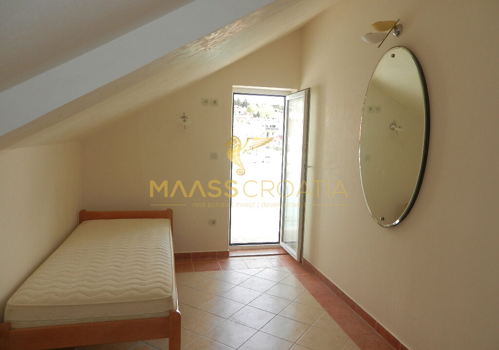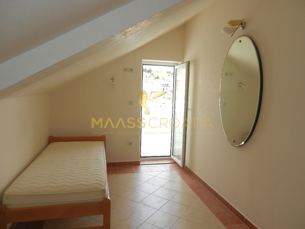 Das Obergeschoss und Dachgeschoss ist eine Maisonette-Wohnung von 66m2, mit zwei Schlafzimmern, Küche und Wohnzimmer, zwei Bäder, Balkon 3m2, Terrasse 10m2 mit Panoramablick auf das Meer.