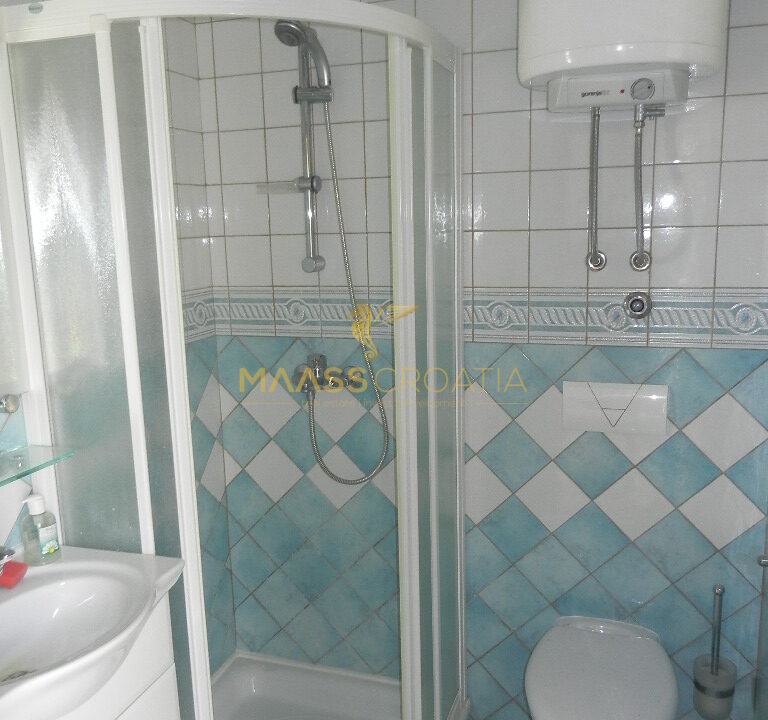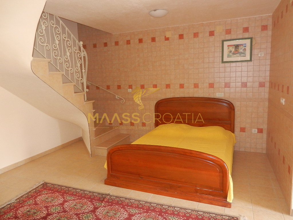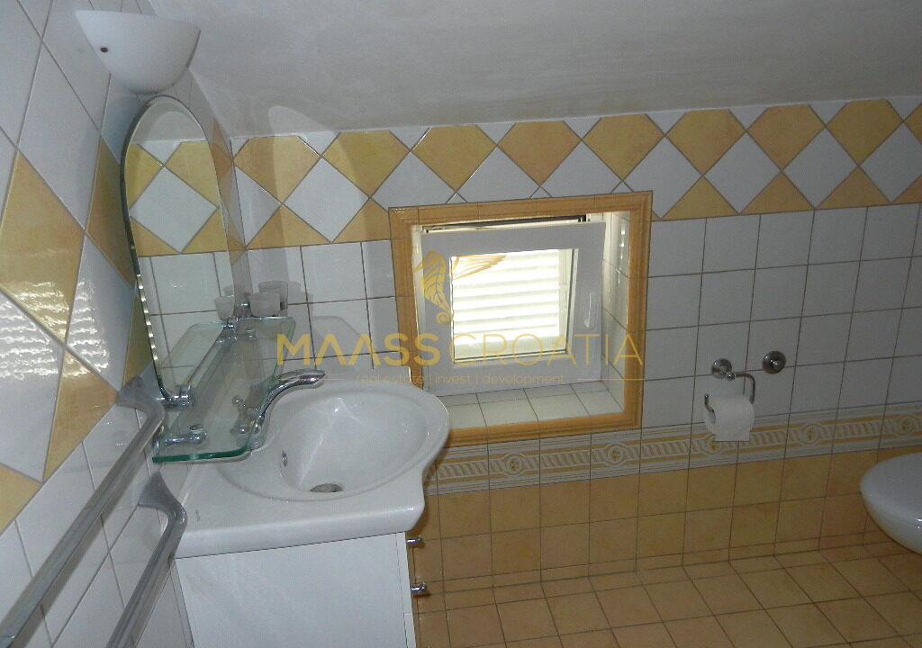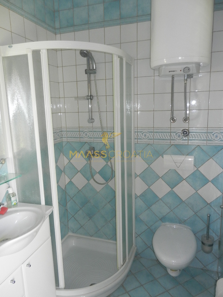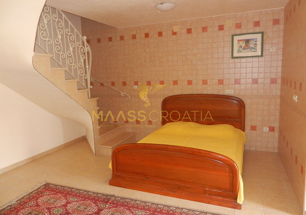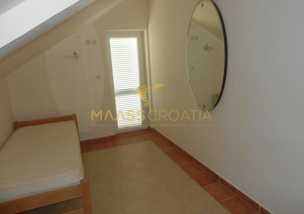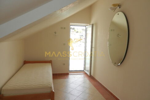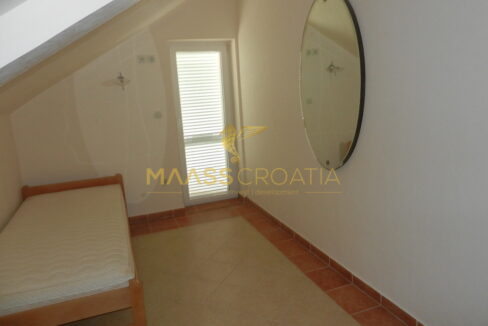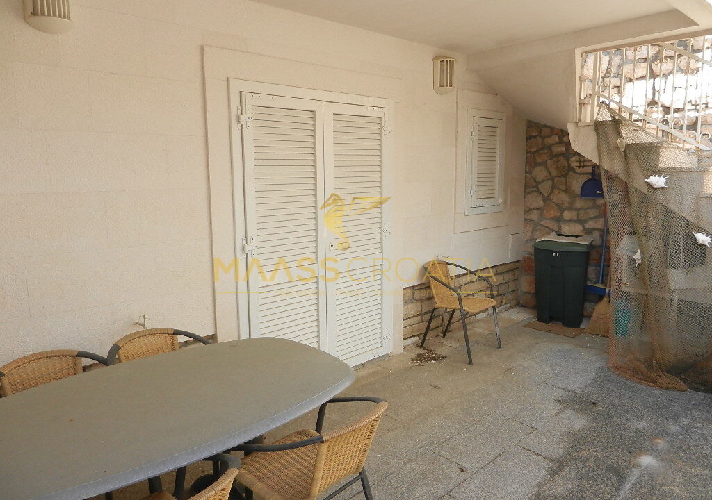 Das Obergeschoss und Dachgeschoss ist eine Maisonette-Wohnung von 66m2, mit zwei Schlafzimmern, Küche und Wohnzimmer, zwei Bäder, Balkon 3m2, Terrasse 10m2 mit Panoramablick auf das Meer.