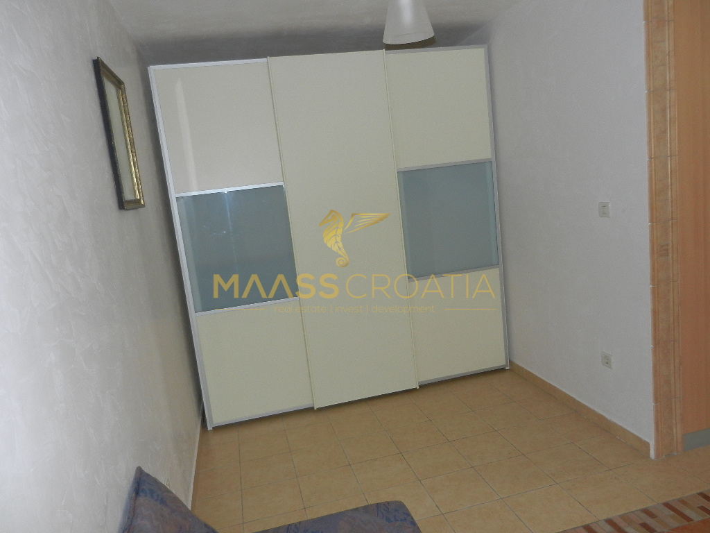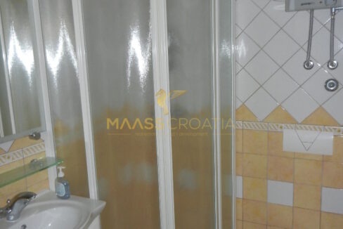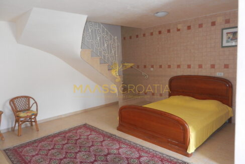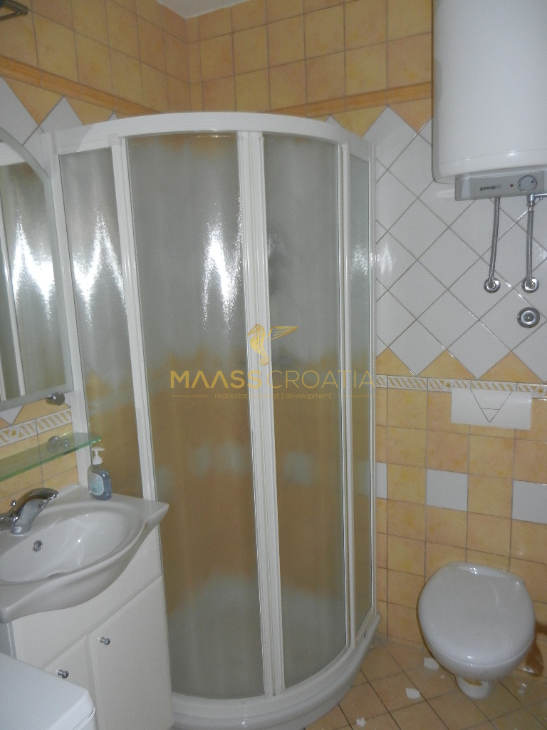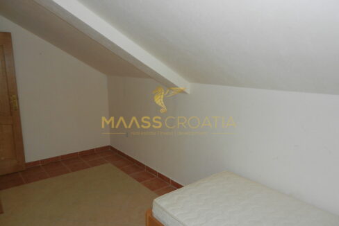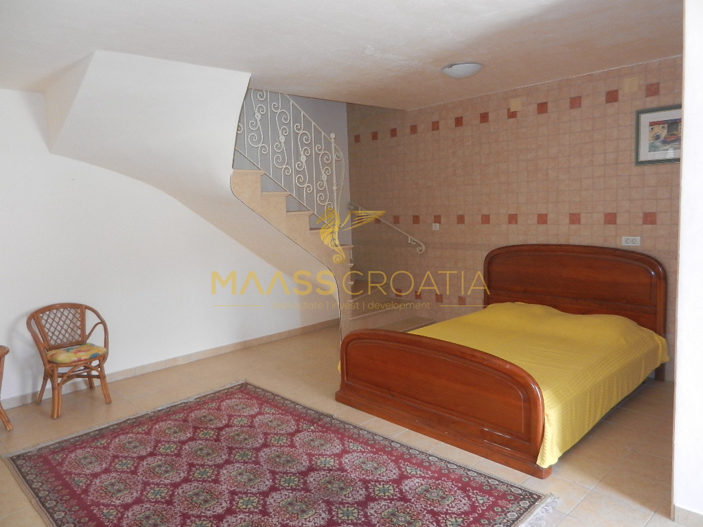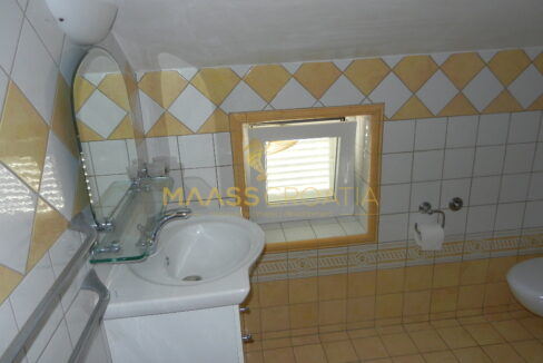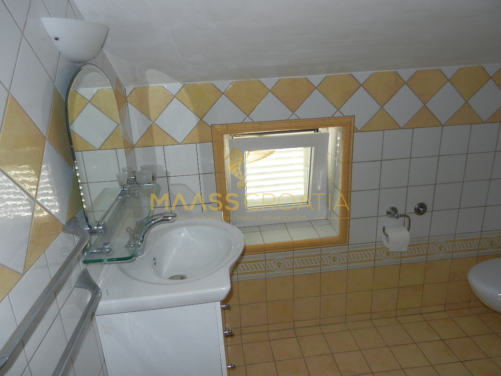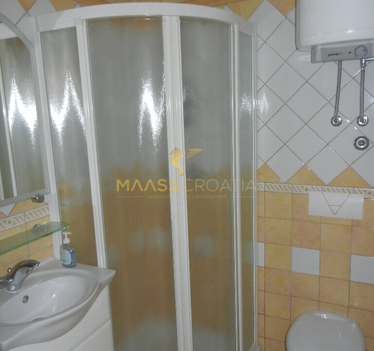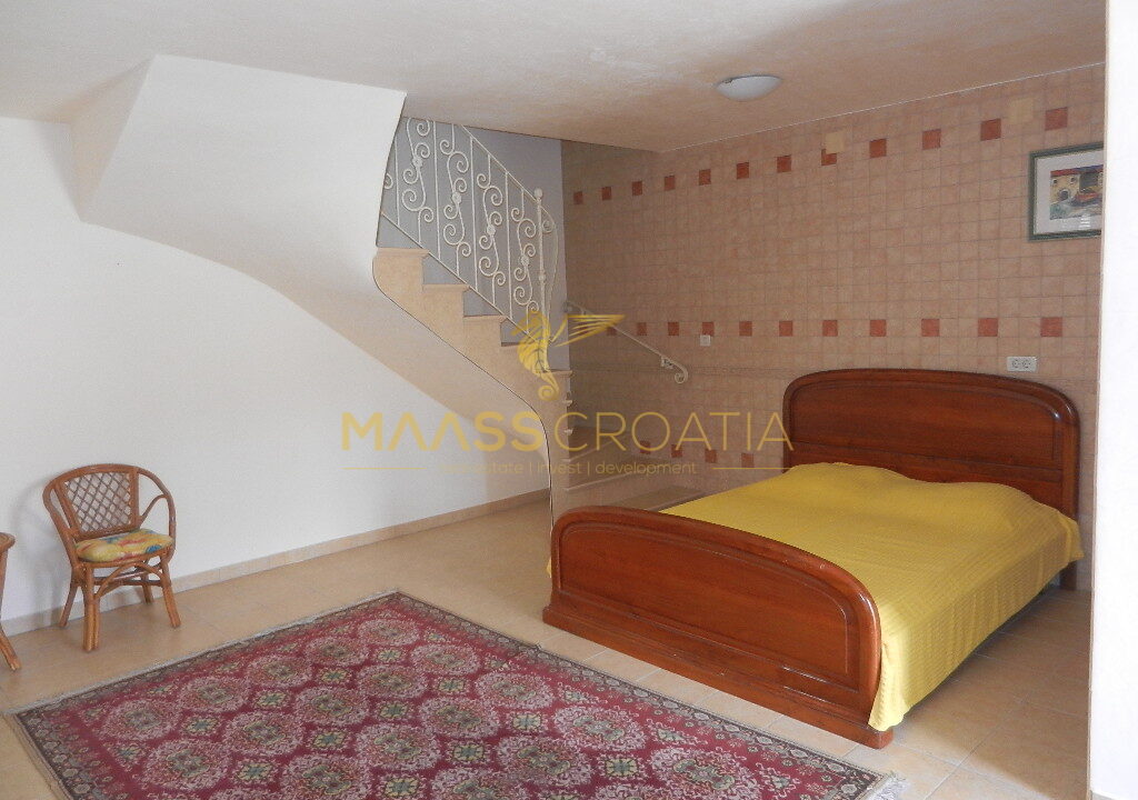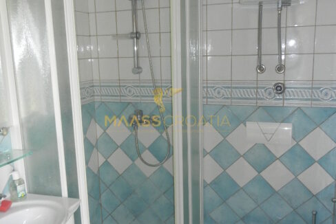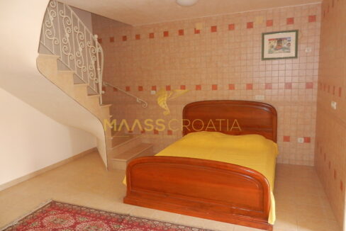 Das Obergeschoss und Dachgeschoss ist eine Maisonette-Wohnung von 66m2, mit zwei Schlafzimmern, Küche und Wohnzimmer, zwei Bäder, Balkon 3m2, Terrasse 10m2 mit Panoramablick auf das Meer.