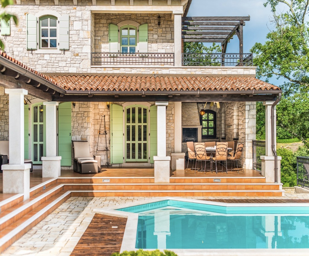 Große Fenster mit salbeigrünen Fensterläden verleihen dem Haus einen rustikalen Karakter.