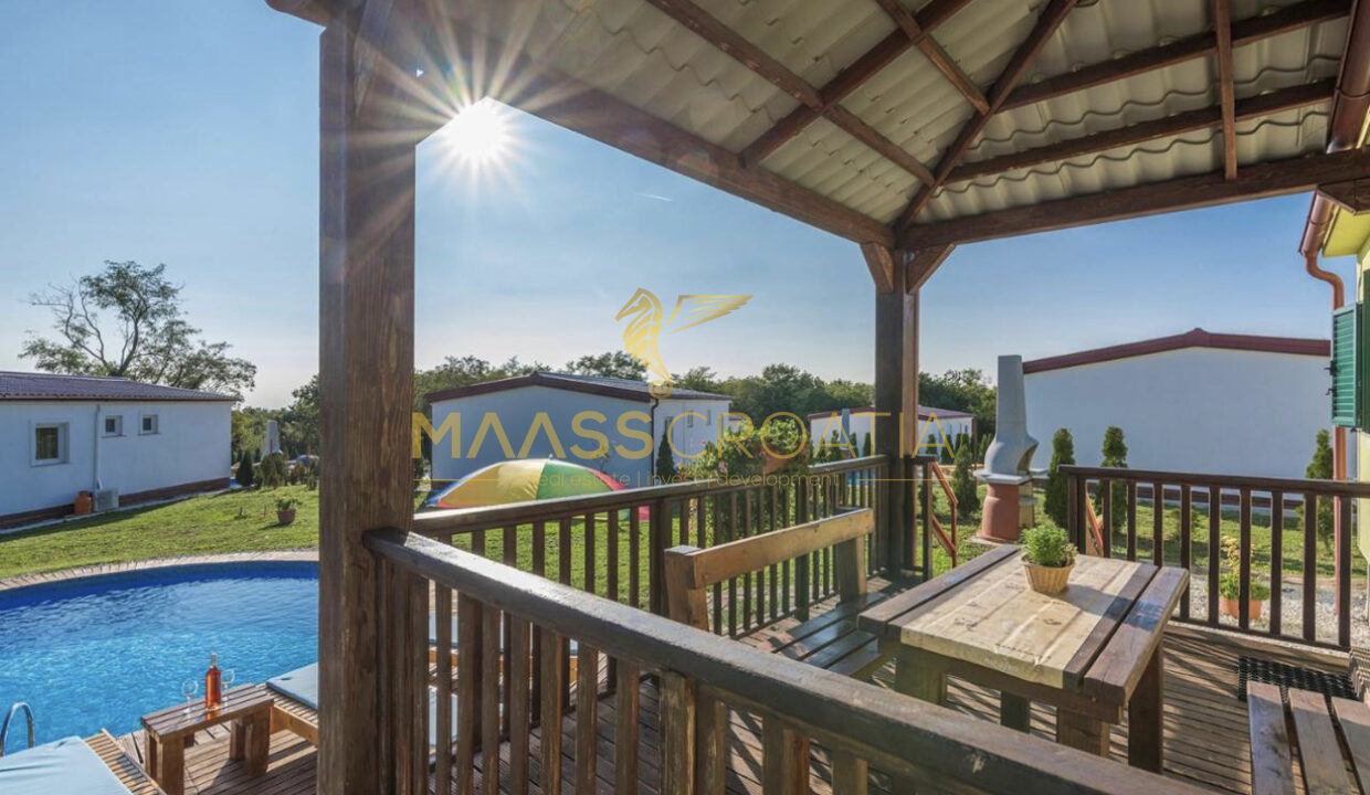 Ferienpark mit 9 Ferienhäusern in ruhiger und sonniger Lage, etwa 5 km vom Zentrum von Tinjan, 20 km vom Meer und dem Strand entfernt, auf einem Grundstück von 11547 m2.