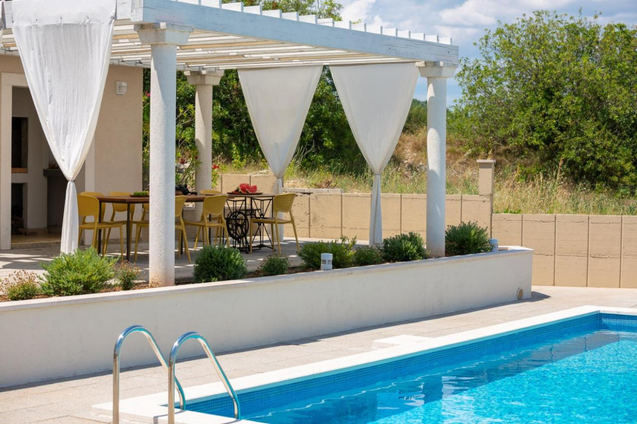 Die bereits erwähnte wunderbare Terrasse steht auf 4 Säulen und ist überdacht. Sie ist ein herrlicher Ort zum Entspannen und bietet eine großartige Verbindung zur Außenküche und zum Swimmingpool.