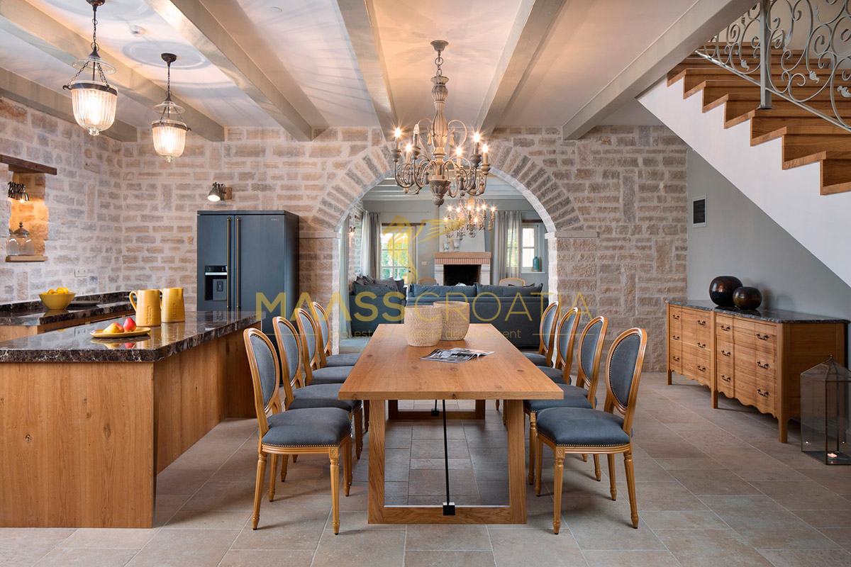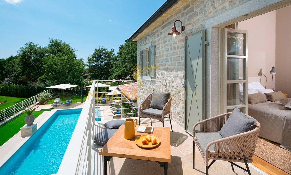 Zum Verkauf steht eine Luxusvilla mit Pool und 359 m2 Wohnfläche, einer Gartenfläche von 880 m, etwa 15 km von Poreč und ca. 16 km vom Meer entfernt, mit zwei vollklimatisierten Etagen.