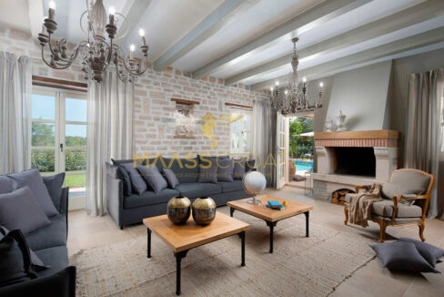 Im Erdgeschoss des Hauses befindet sich ein geräumiges Wohnzimmer mit Kamin und SAT-TV und Zugang zu einer großzügigen überdachten Terrasse mit Esstisch, Kamin zum Grillen und einem Loungebereich, eine große, voll ausgestattete Küche mit Essplatz Zimmer, ein Doppelschlafzimmer und ein Doppelbett, letztes WC und Ausgang zur Terrasse, separates WC im Wohnbereich und Dusche/WC auf der Terrasse.