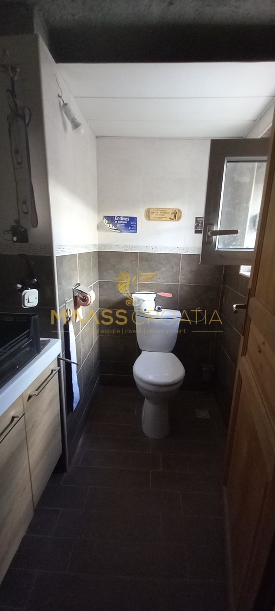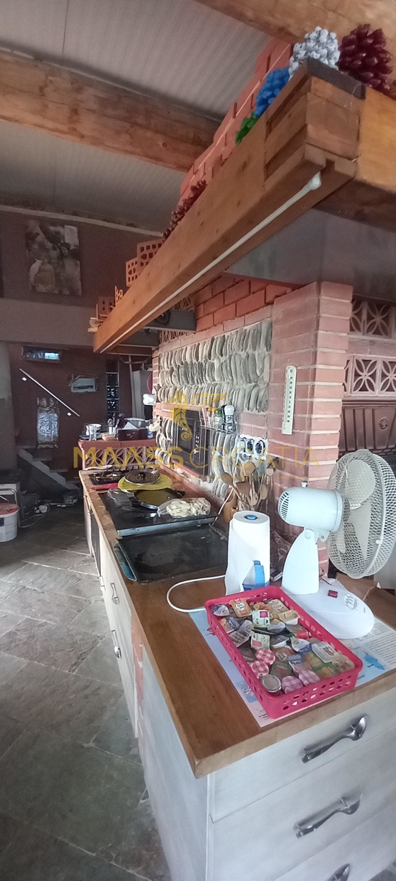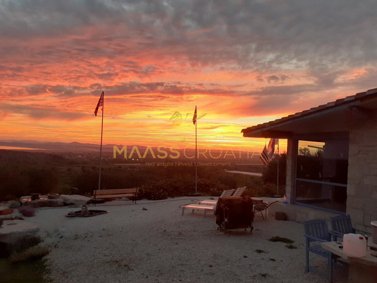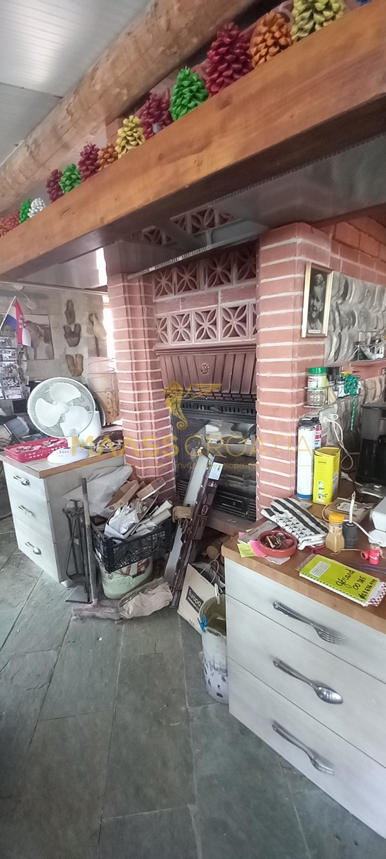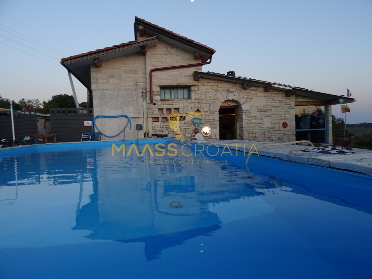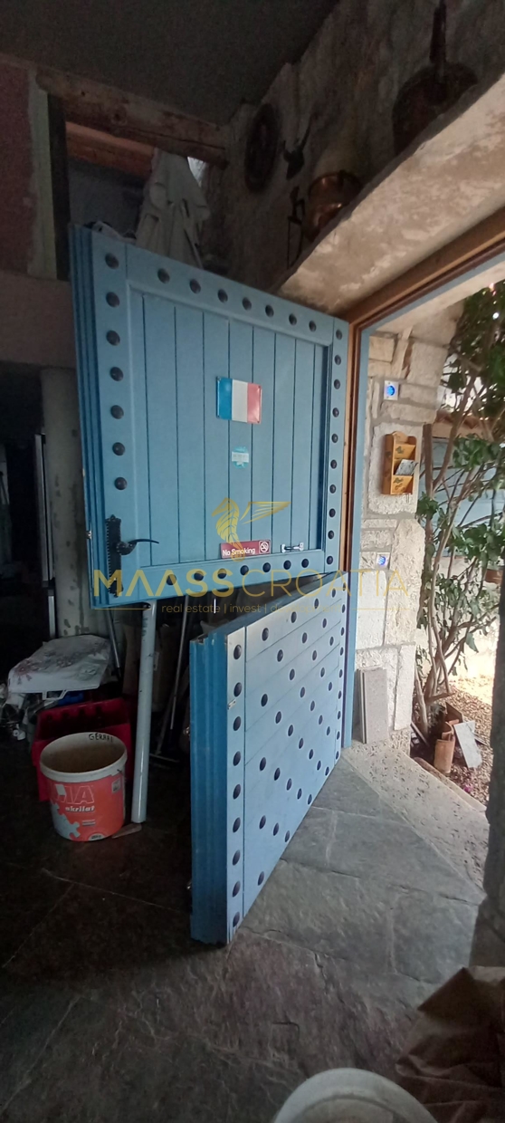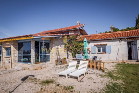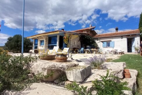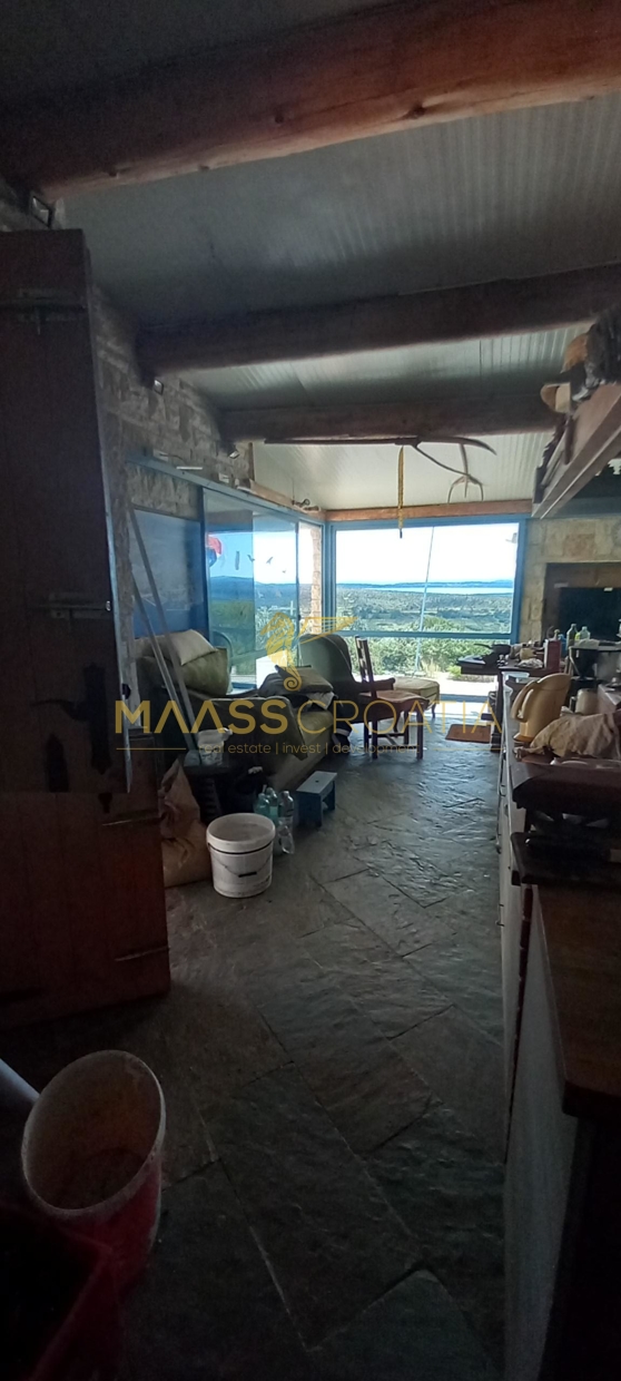 Gebäude 2 ist einmal von der Poolseite, als auch von der Seite neben dem Gebäude 1 begehbar. Hier offenbart sich ein wahrer Schatz voller handgemachter Kunstwerke, kreativer Einrichtungsideen und in die Wand eingefügter selbst gesammelter Steine welche die Küchenrückwand zieren. Alles ist vom Besitzer selbst gebaut und mit viel Liebe zum Detail und kreativ hergerichtet. Das absolute Highlight ist die mitten im Raum stehenede Küchenisel, um die man sichbeim Kochen “herum arbeiten” muß, denn auf der einen Seite der Insel ist das Spülbecken mit Arbeitsfläche drumherum angebracht, auf der anderen Seite Kochfeld und Ofen, und auf der Seite zum Couchbereich und den panoramaartigen Fenstern ist ein Holzofen zum Heizen eingebaut. Von diesem Bereich hat man, wie von einem Thron, einen wirklich atemberaubenden Blick auf die Ortschaft, als auch auf Pakostane, den Vranasee und das Meer.