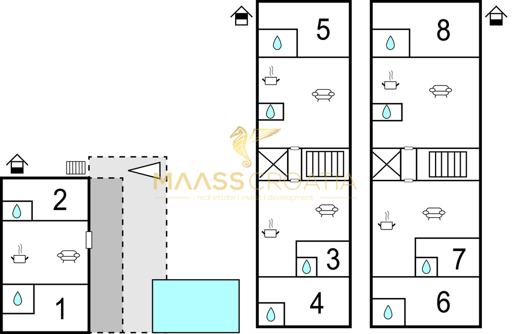 Das Haus besteht aus fünf komplett möblierten und mit allen Extras ausgestatteten Wohneinheiten.