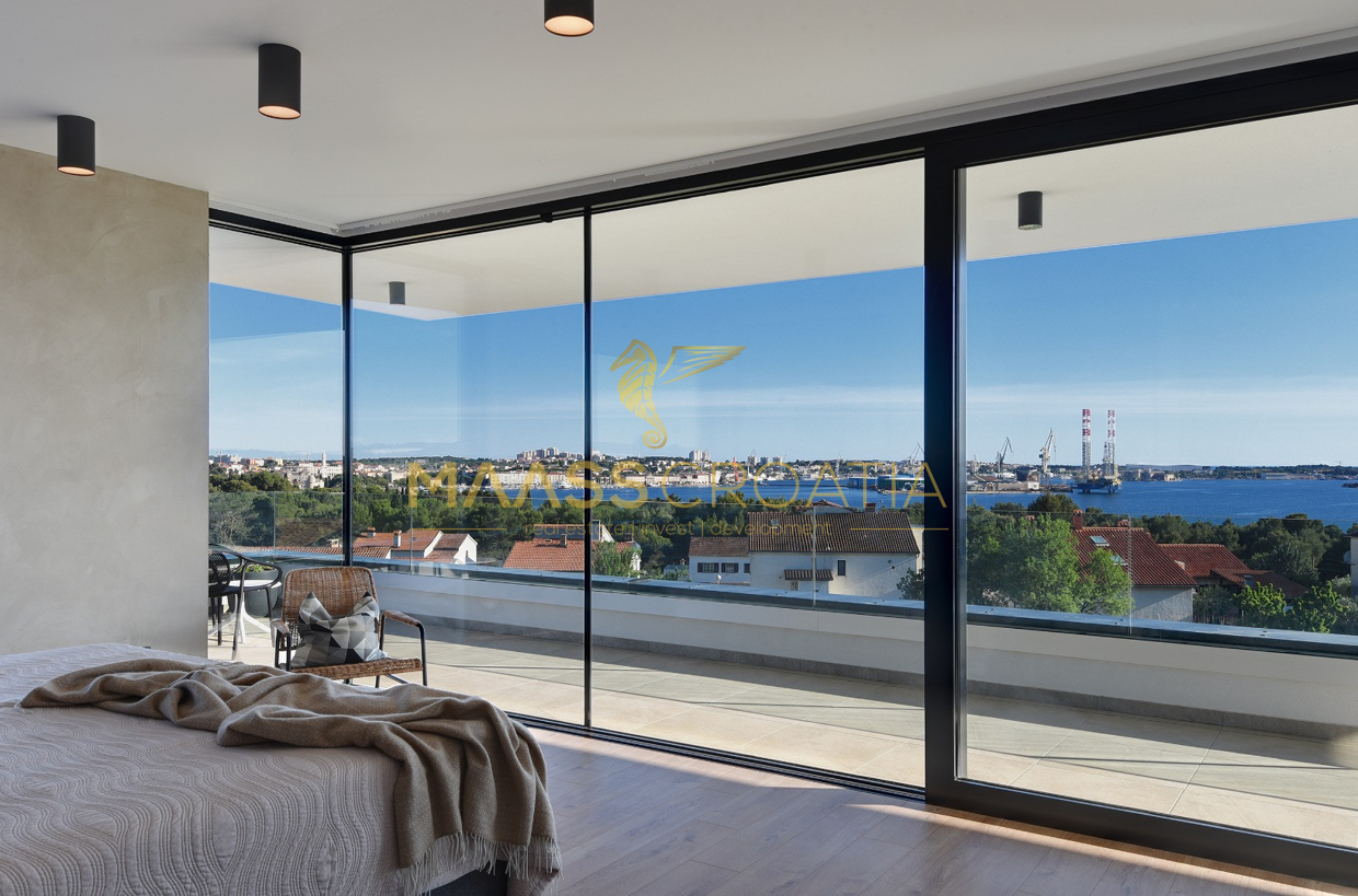 Die rieseigen Fensterflächen die vom Boden bis zur Decke und von Wand zu Wand reichen, lassen viel Sonnenlicht und Wärme hinein und unterstreichen das moderne Loft-Design. Außerdem bieten sie, vor allem von den oberen Räumen einen wunderschönen Blick auf Pula und den Hafen mit der berühmten Werft von Pula.