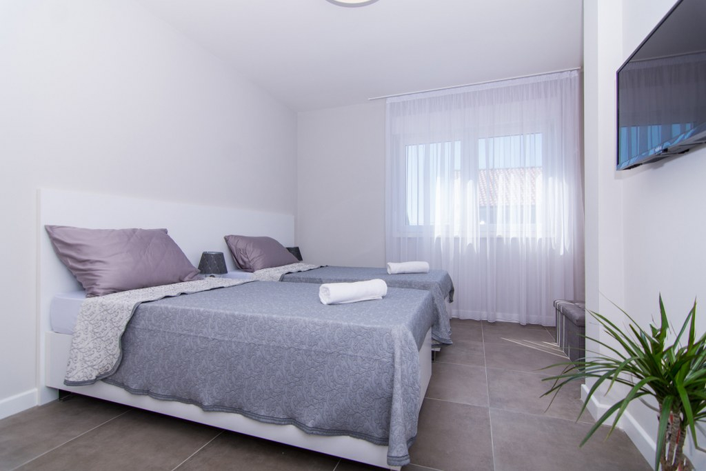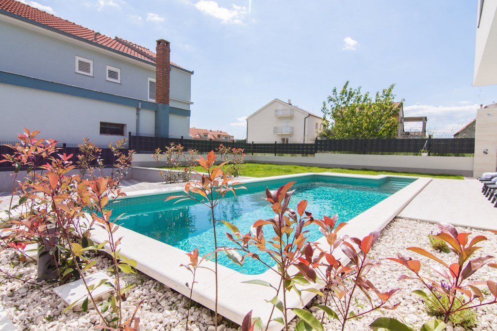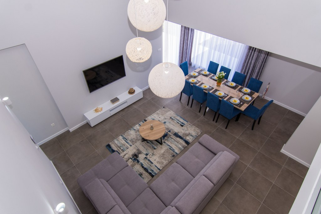Der großzügige Swimmingpool auf der Terrasse im Erdgeschoss ist wohl das Highlight und bildet den idealen Ort für gesellige Treffen mit Freunden und Familie. Neben einer formschönen Terrasse, die Innen- und Außenbereich harmonisch verbindet, bietet dieser Essbereich die perfekte Mischung aus Entspannung, Panoramablick, kulinarischen Genüssen und gemütlichen Stunden mit Familie und Freunden. Im hinteren Teil des Gartens, eingebettet in eine kleine Gartenecke, lädt ein Steingrill zum Verweilen ein. Die minimalistische Gartengestaltung bietet wenig Spielraum für Pflanzen und Tiere, setzt aber dennoch farbliche Akzente im ansonsten schlichten und eleganten Grundriss. Strand und Stadtzentrum sind bequem zu Fuß erreichbar, sodass Sie die historische Altstadt von Kašteli in wenigen Minuten erreichen. Dieses Anwesen besticht durch seine traumhafte Lage und wird Sie verzaubern. Frische Luft, klares Wasser und die farbenfrohe Landschaft schaffen eine harmonische und entspannte Atmosphäre.