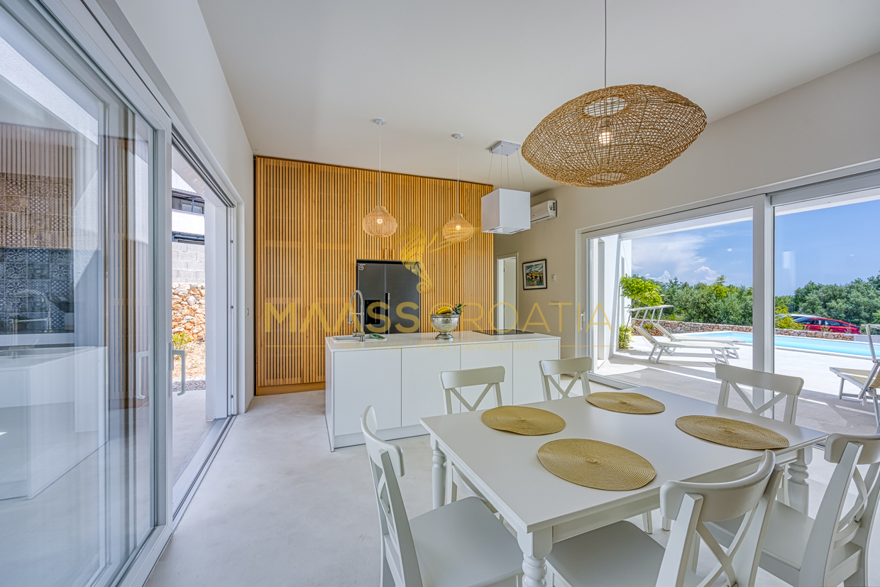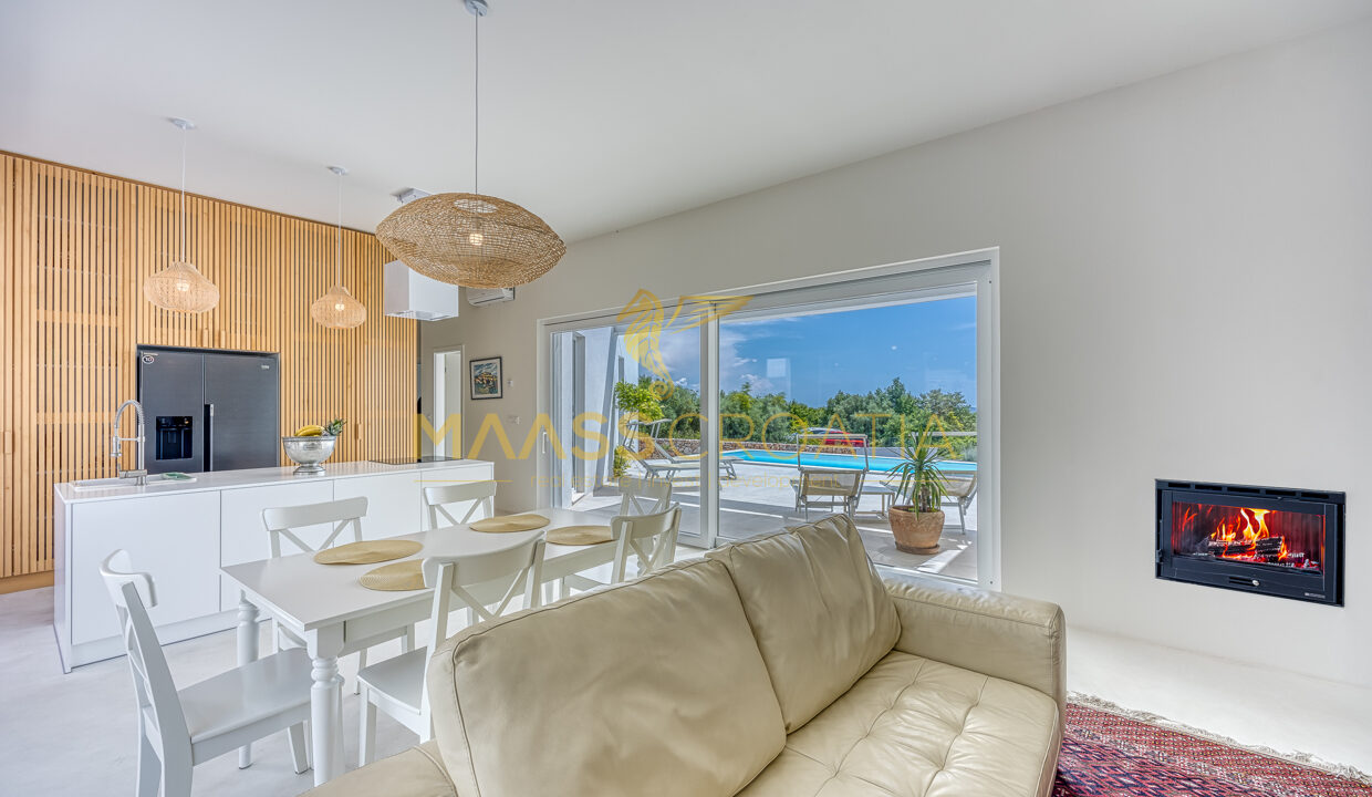 Das Haus wird durch eine großzügige überdachte Terrasse von 32m² sowie einen “Infinity”-Pool mit Salzwasser von 30m², mit Sonnenterrasse und Pergola, bereichert.