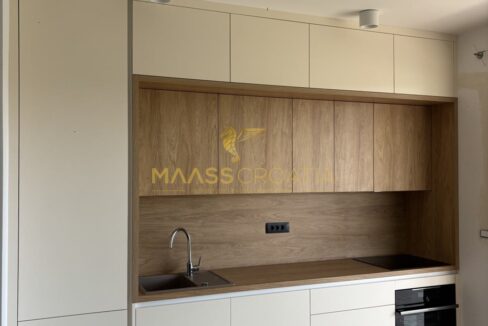 Das helle und geräumige Wohnzimmer verfügt über ein Designer-Ledersofa mit verstellbaren Rückenlehnen, einen Designer-Couchtisch aus Holz und einen neuen Samsung-Fernseher.