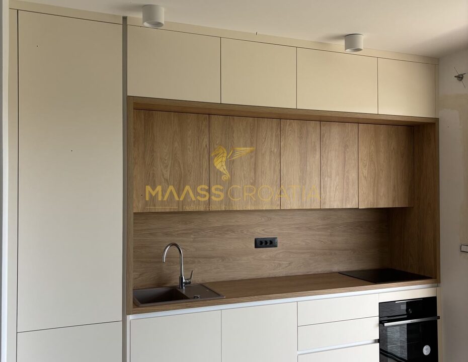 Die maßgefertigte Küche ist mit stimmungsvoller Beleuchtung und brandneuen, hochwertigen Geräten mit Garantie ausgestattet (Heier Kühl-/Gefrierschrank, Bosch Waschmaschine, Heier Pyrolyse-Backofen, Dunstabzugshaube).