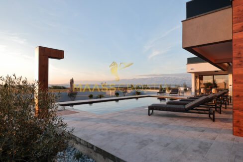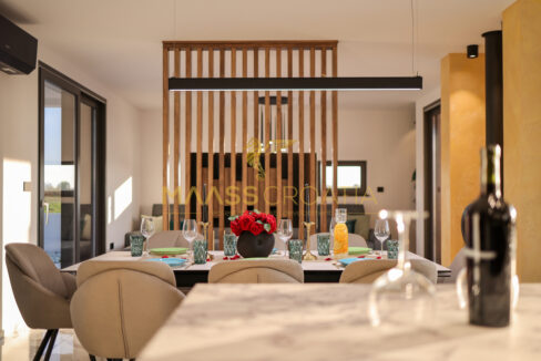 Im Erdgeschoss befindet sich ein großes Wohnzimmer mit einer Küche und einem Esszimmer im Open-Space-Konzept sowie einem Ausgang zu einer großen Terrasse mit Swimmingpool.