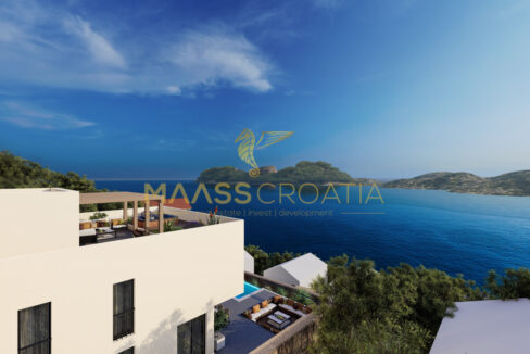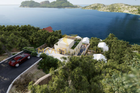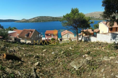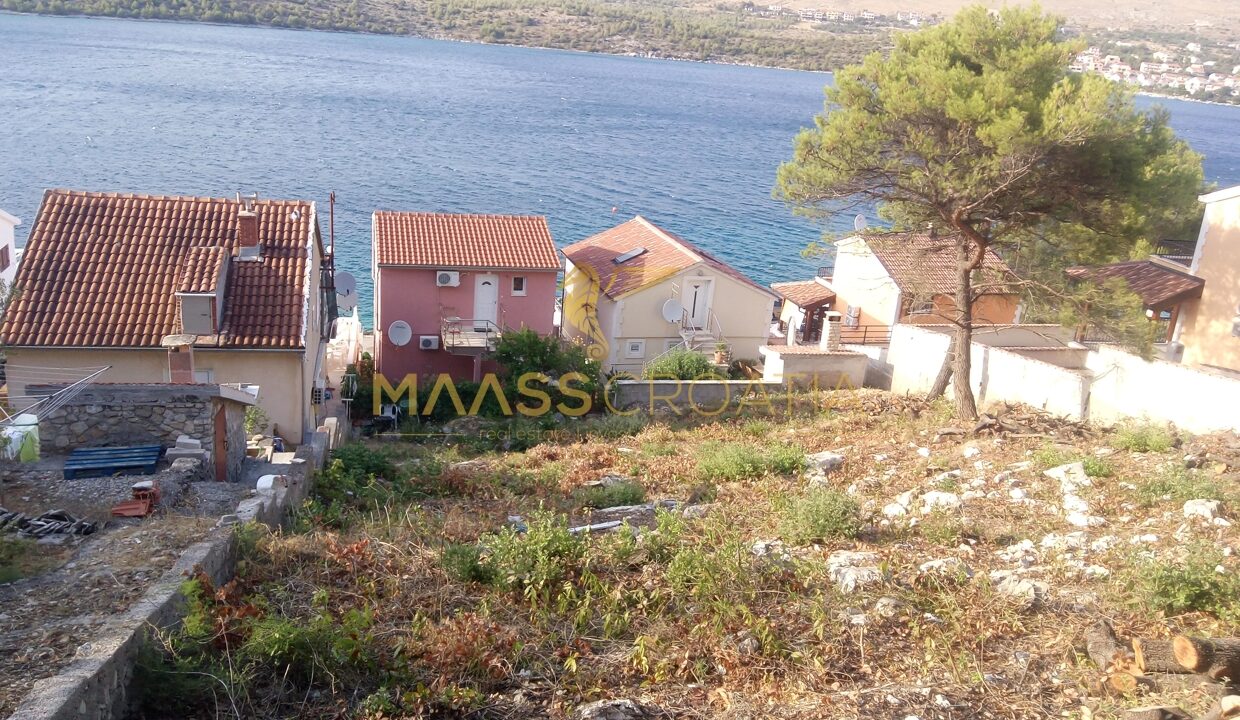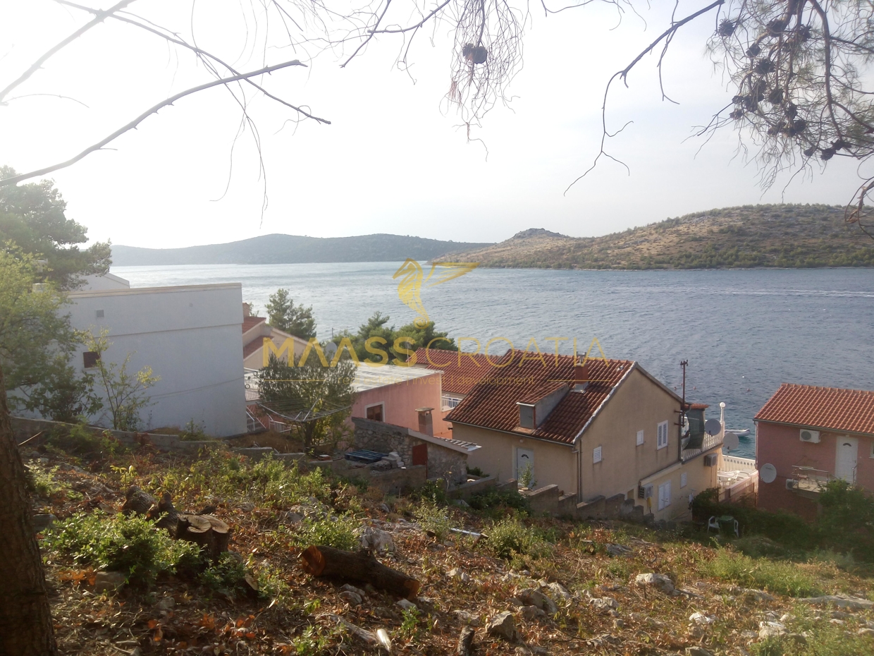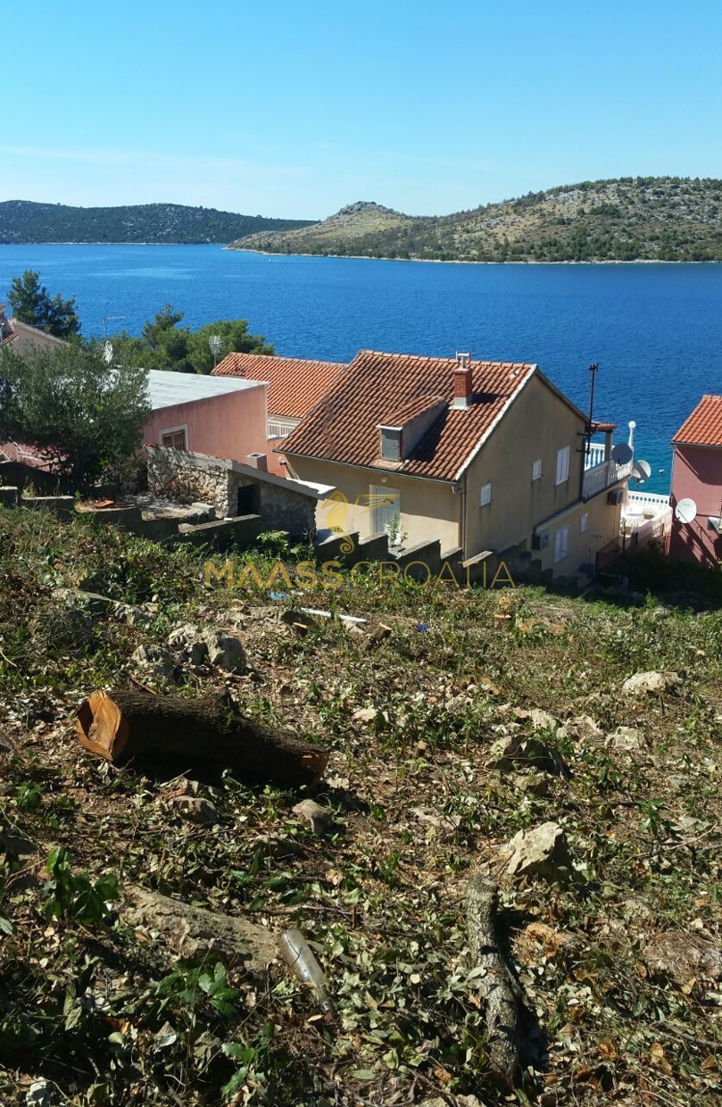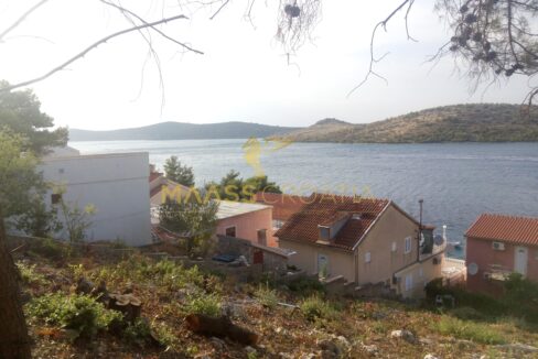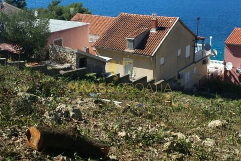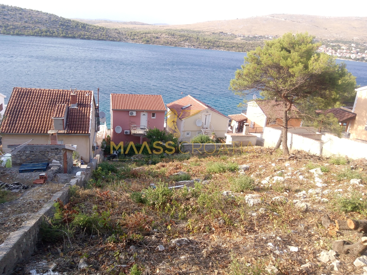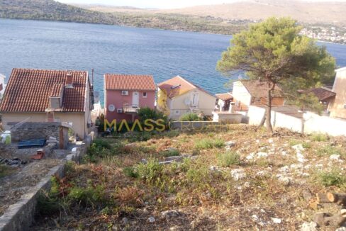 Der Zugang zum rechteckigen Grundstück erfolgt über die Hauptstraße, das Gelände befindet sich in Hanglage und bietet einen freien Blick auf das Meer.