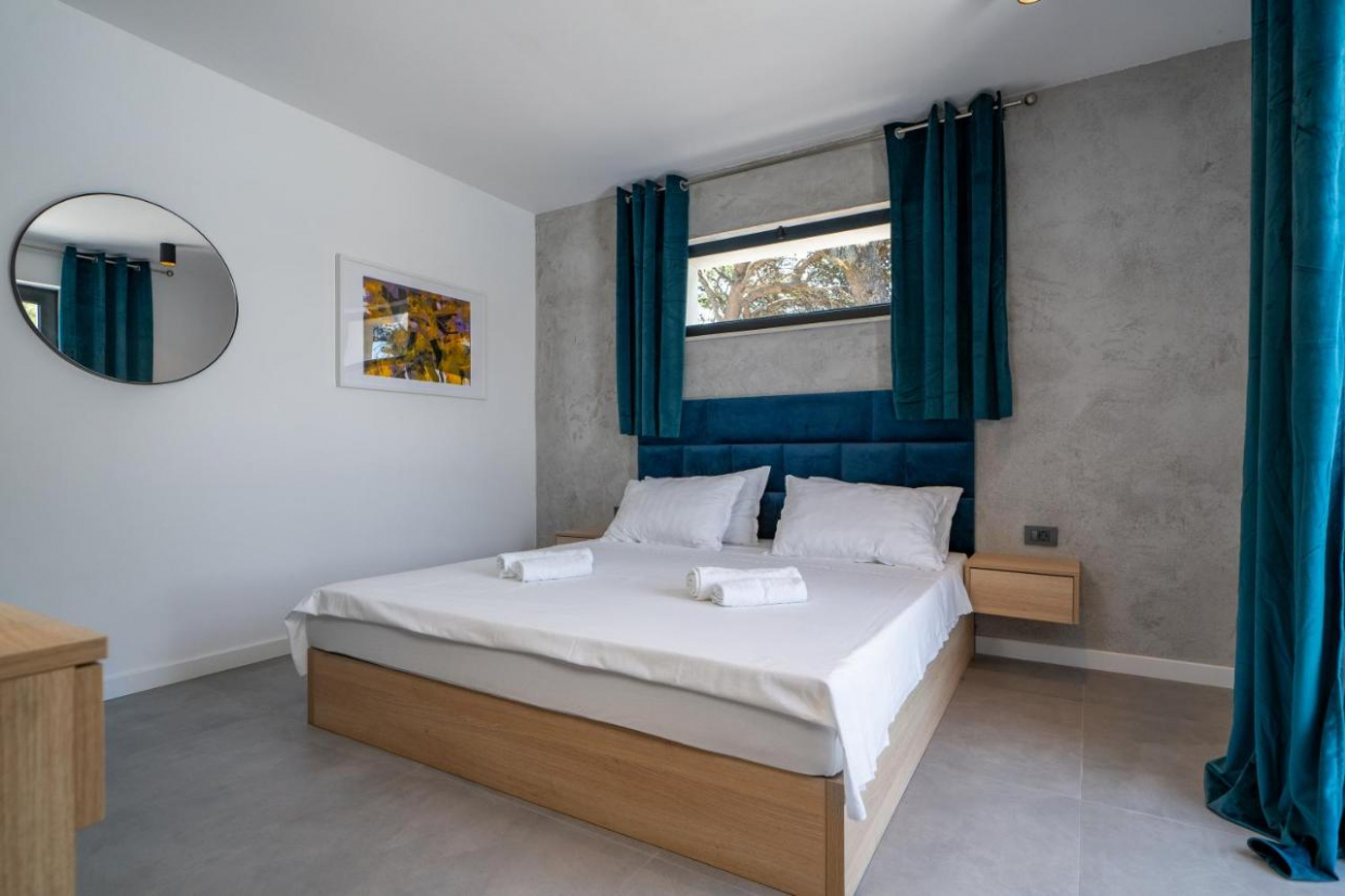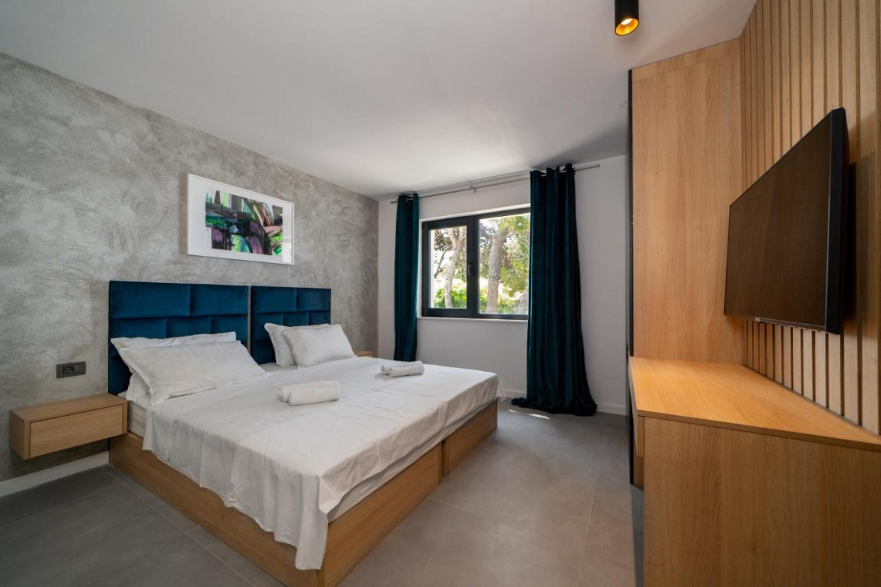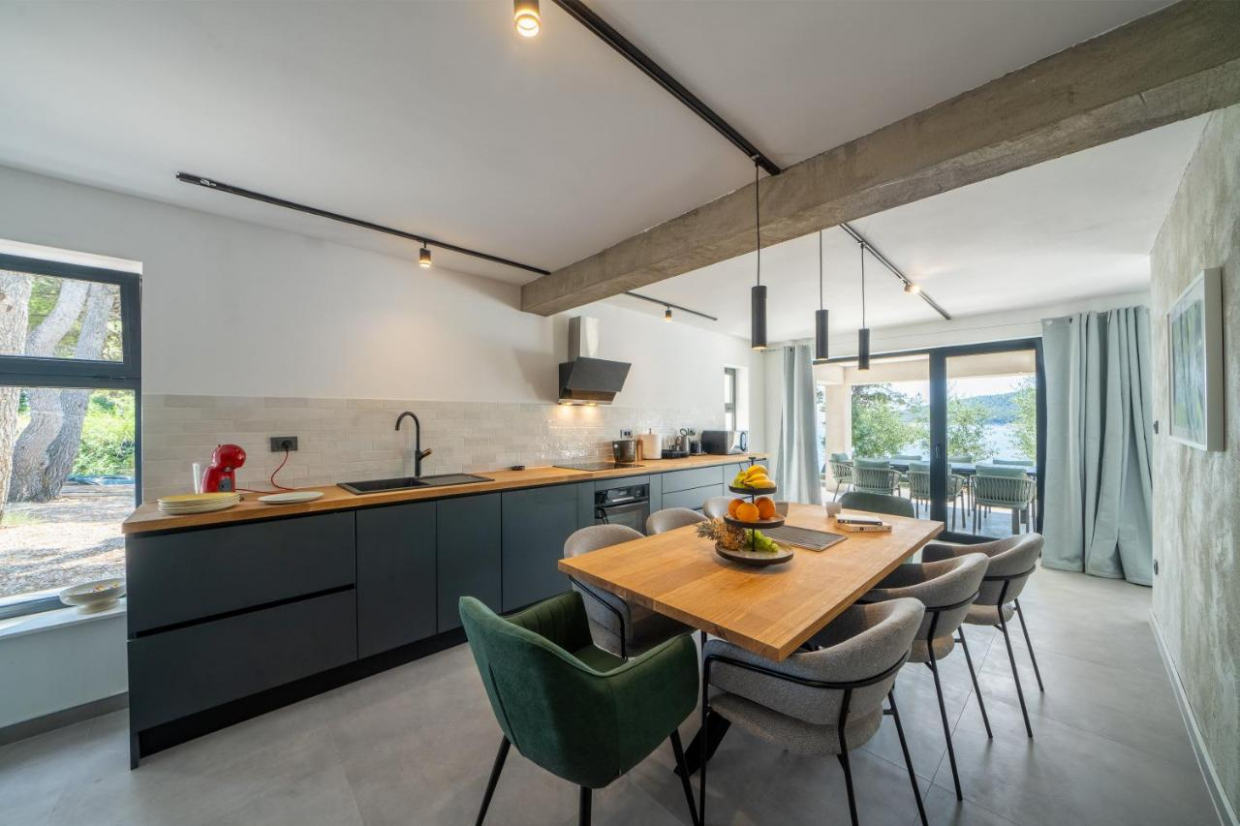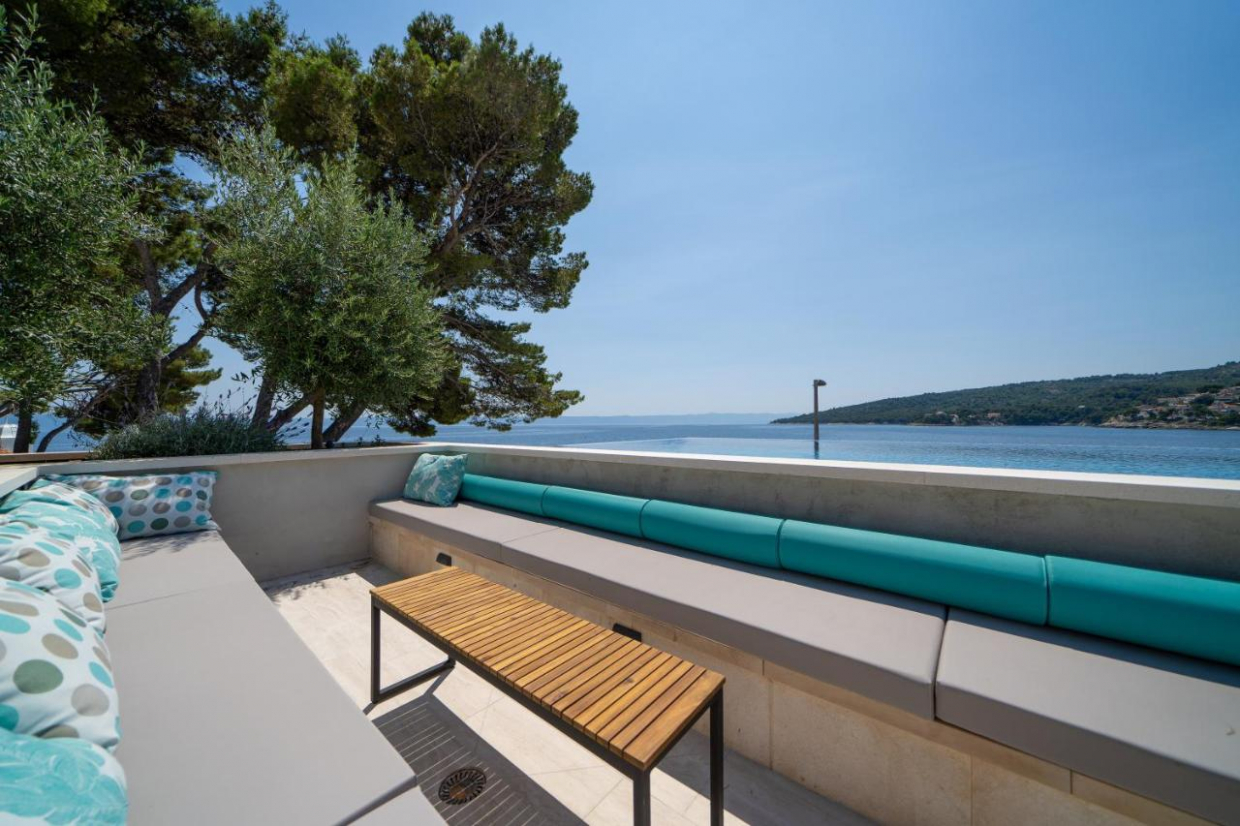 Entspannen Sie sich im weitläufigen Außenbereich, der sich auf einem 1100 m2 großen Grundstück befindet. Der üppige Garten und die Terrasse bieten den idealen Rahmen, um im Freien zu speisen oder ein Glas Wein zu genießen, während Sie den Sonnenuntergang über dem kristallklaren Wasser der Adria betrachten.