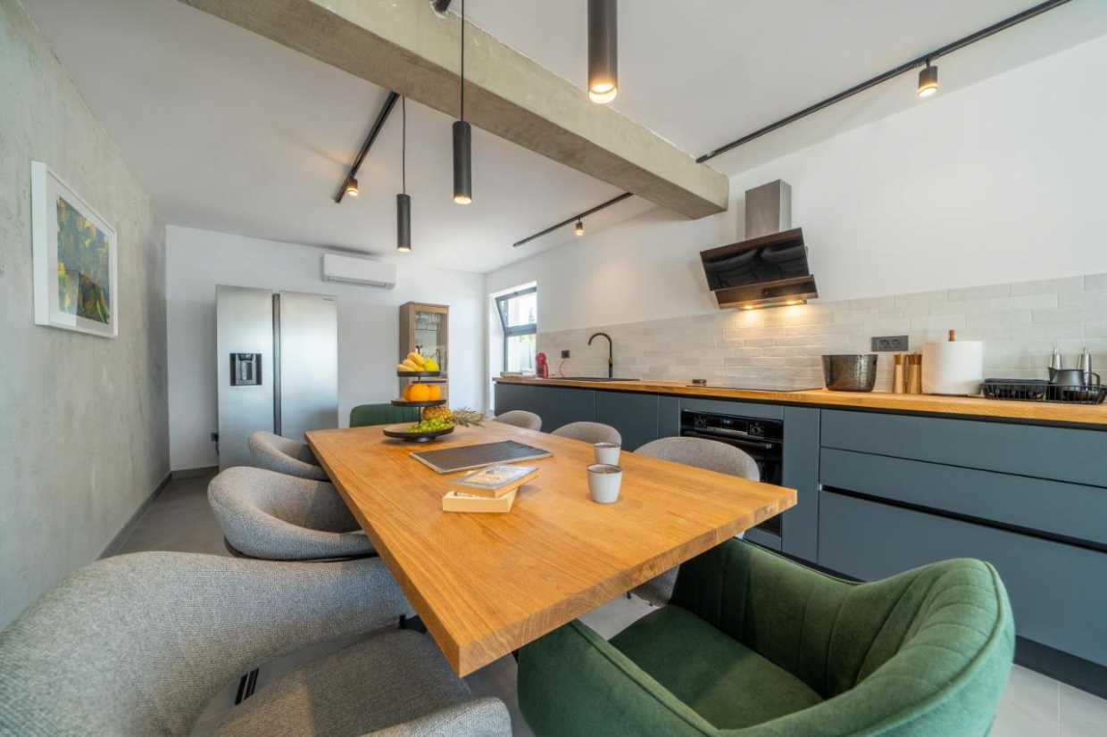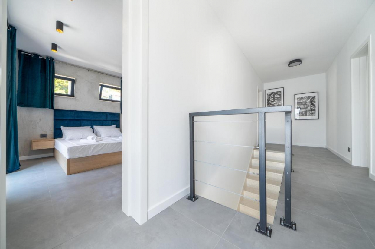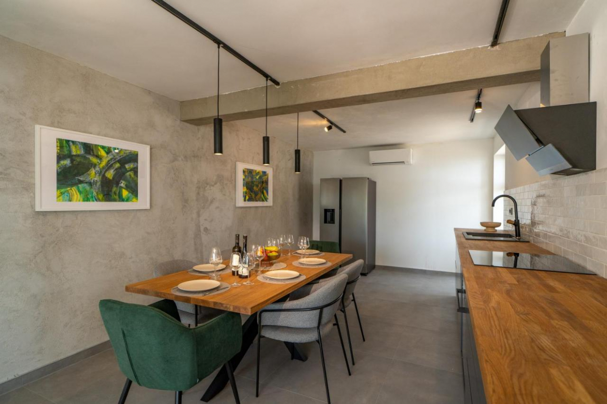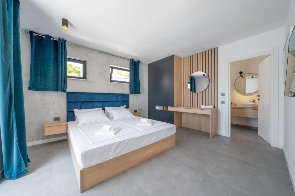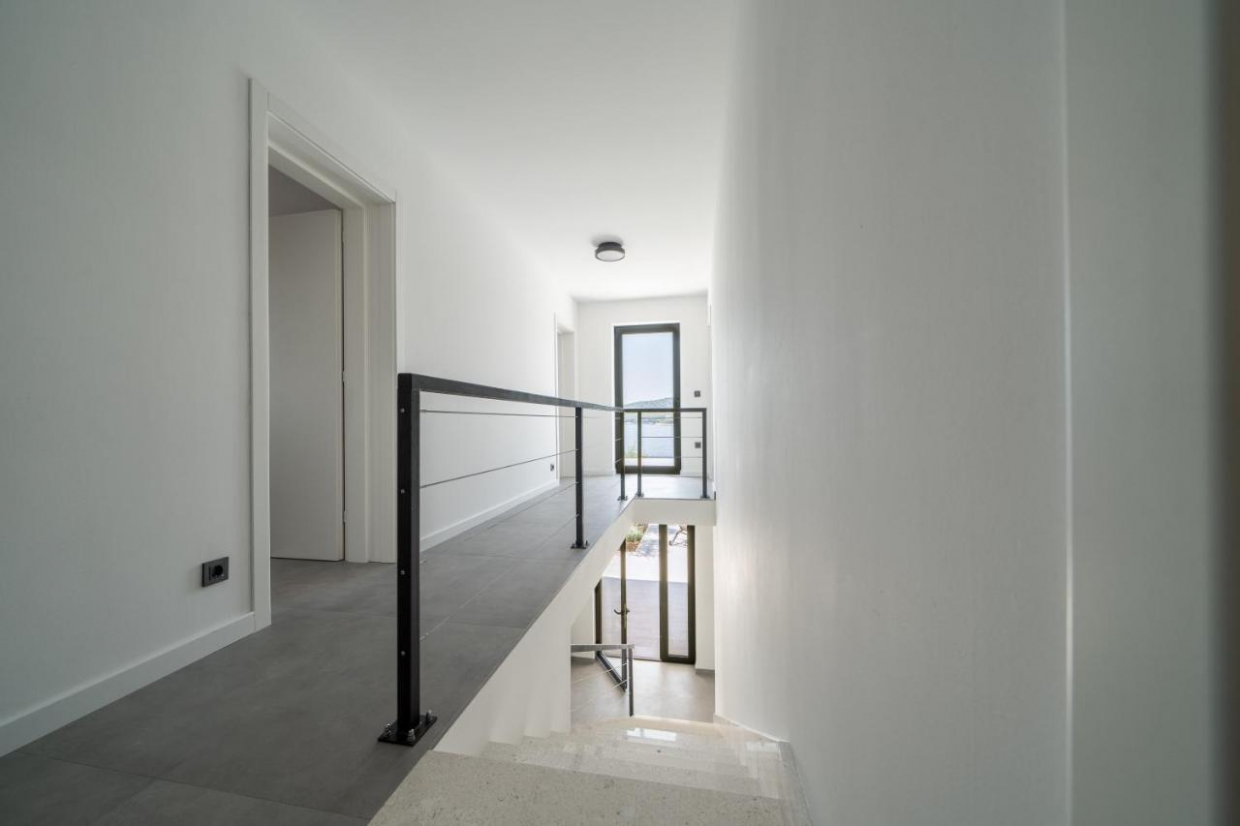 Entspannen Sie sich im weitläufigen Außenbereich, der sich auf einem 1100 m2 großen Grundstück befindet. Der üppige Garten und die Terrasse bieten den idealen Rahmen, um im Freien zu speisen oder ein Glas Wein zu genießen, während Sie den Sonnenuntergang über dem kristallklaren Wasser der Adria betrachten.