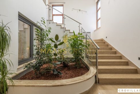 Im Erdgeschoss dieser attraktiven Villa befindet sich eine kleine Eingangshalle, eine moderne und voll ausgestattete Küche mit Esszimmer und ein Wohnzimmer, das durch Glaswände mit Tageslicht durchflutet wird und durch das auch ein Ausgang zur Terrasse besteht und ein angelegter grüner Garten mit eigenem Wintergarten