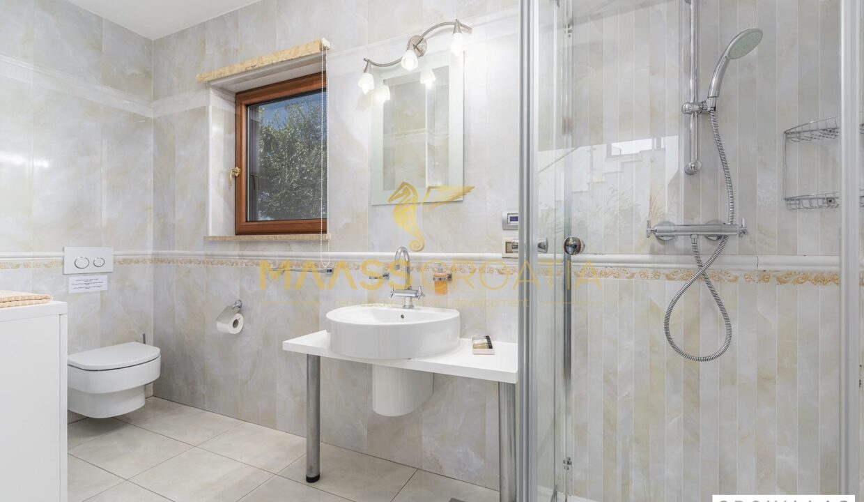 In erster Reihe zum Meer, nur 100 m vom ersten Strand entfernt, befindet sich diese idyllische zweistöckige moderne Villa mit einer Gesamtwohnfläche von 320 m² und einem zusätzlichen Nebengebäude von 40 m² auf einem großzügigen Grundstück von 1070 m².