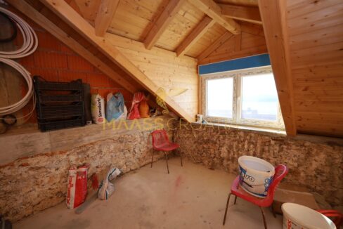 Im 1. Stock gibt es einen Raum mit Küche und Wohnzimmer sowie eine Innentreppe (die nicht angebracht wurde) zu einem hohen Dachboden, wo sich ein Badezimmer und ein Schlafzimmer mit Blick auf das Meer befinden.
