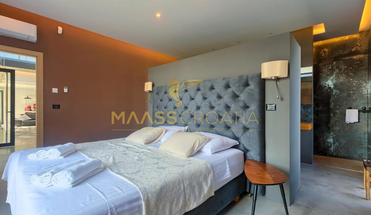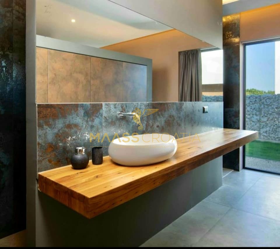 Die Villa ist komplett neu, wurde Ende 2021 fertiggestellt und zeichnet sich durch einen unvergesslichen architektonischen Ausdruck aus, der nicht unbemerkt bleiben kann. Es ist inspiriert von dem in der Welt der Architektur bekannten Bürogebäude Grande Arche in Paris, das durch einen großen Bogen gekennzeichnet ist, der die beiden Gebäude verbindet. Im Inneren dieser istrischen Villa sticht die innere Eingangslobby mit einer Höhe von bis zu 7,5 Metern hervor, die von einer luftigen Treppe umgeben ist, die in den ersten Stock führt. Besonders attraktiv ist die Nähe des Pools zum Innenraum – versteckt unter der oberen Etage, nur 5 Meter vom Wohn- und Esszimmer und 2 Meter von der Küche entfernt, was eine besondere Atmosphäre verleiht.