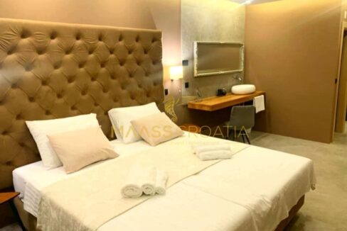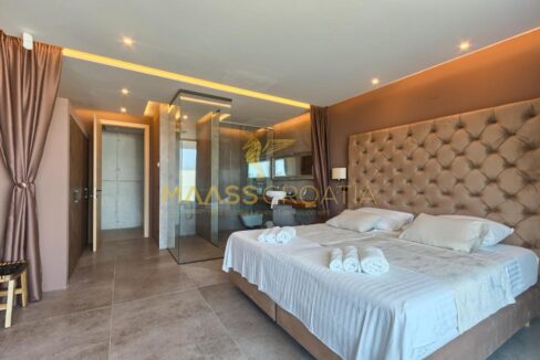 Die Zimmer sind modern mit viel Licht und Glasflächen eingerichtet, und von ihnen haben Sie einen wunderschönen Blick auf das Meer und die Inseln von Losinj. Das Haus ist behindertengerecht, da es keine Treppen gibt und das Erdgeschoss einschließlich des unteren Zimmers auf einer Ebene liegt. Das Haus ist auch für Kleinkinder geeignet, da die Eltern sie beim Baden direkt von der Küche oder dem Wohnzimmer aus sehen. Große überdachte Terrassen spenden den Gästen viel Schatten. Die überdachte Terrasse umfasst auch einen großen Außengrill auf Holz und Holzkohle und eine Sommerküche im Freien. Das Grundstück ist allseitig eingezäunt, was Ihnen Ruhe und Sicherheit gibt.Rund um das Haus wurde eine zusätzliche Entwässerung vorgenommen und in den Schluckbrunnen geführt. Das gesamte Glas im Haus ist dreischichtig und auf beiden Seiten mit einer E-Low-Beschichtung gehärtet, um die Temperatur zu erhalten. Aluminiumtischlerei ist mit einer speziellen Beschichtung zum besseren Schutz gegen Salz beschichtet. Die Fliesen sind alle 80×160 cm groß und aus Spanien importiert. Im ganzen Haus wurde die Decke abgesenkt und auch in den Fluren wurde eine indirekte Beleuchtung vorgenommen.