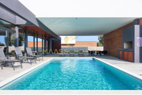 Die Villa verfügt über einen mit einem Smartphone verbundenen Alarm, ein Fernaktivierungs- und Deaktivierungssystem, mit einem Smartphone verbundene Kameras, unabhängige Rekorder usw. Das Haus verfügt über ein schwimmendes Eingangstor mit Fernbedienung, eine Eingangstür mit Code-Eingabesystem, ein Rasenbewässerungssystem Füllen Sie den Pool aus Ihrem eigenen Brunnen. Das Haus besteht vollständig aus Stahlbeton mit großen Spannweiten, ohne Ziegel, mit den höchsten Standards gegen Erdbeben. Es ist allseitig wärme- und hydroisoliert. Auf dem Dach sind im Herbst 28 cm XPS-Dämmplatten angebracht, an den Wänden sind 15 cm Rofix-Graphit-Styropor. Auch der Pool ist allseitig mit XPS-Dämmplatten gedämmt. An der Fassade gibt es keine Dachrinnen, um das Wasser vom Dach abzuleiten, da sie in der Fassade versteckt sind und zu einem Absorptionsbrunnen geleitet werden, sodass bei Regenschauern kein überschüssiges Wasser auf dem Grundstück steht.Eine zusätzliche UV-Lampe entkeimt das Beckenwasser weitestgehend, sodass Bakterien und Viren nicht überleben können. Die Hälfte des Beckens ist überdacht, was Menschen zu schätzen wissen, die zu bösartigen Hautkrankheiten neigen. Es ist einfach, es vollständig zu schließen und den Pool im Winter zu nutzen. Der Pool hat eine klassische Treppe und eine flache, faule Landung im Schatten. Darüber hinaus wird der Pool durch eine Wärmepumpe plus Sonnenkollektoren auf dem Dach beheizt, was an kälteren Tagen für zusätzlichen Komfort sorgt. Es ist allseitig mit XPS-Dämmplatten wärmegedämmt und hält so nachts die Temperatur hoch. Darüber hinaus verfügt der Pool über eine Thermodecke, um die Temperatur über Nacht zu halten und den Pool im Winter zu nutzen.