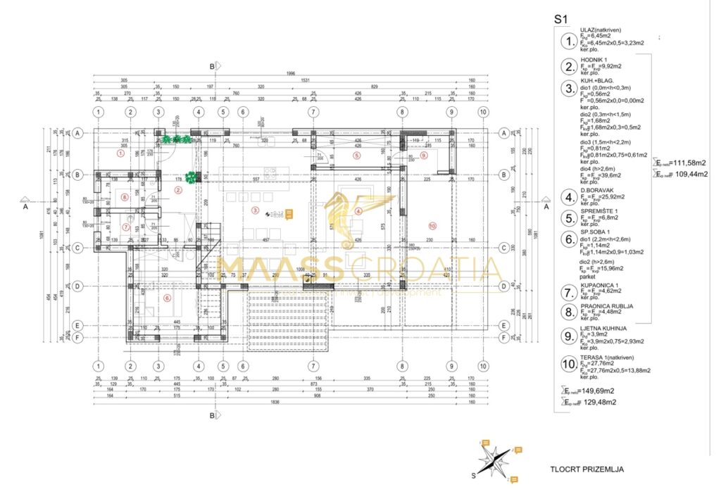 Der großzügige Innenbereich der Villa umfasst den Haupteingangsbereich, Flur, Waschküche, Esszimmer, Wohnzimmer, Küche, von der aus man Zugang zur Terrasse mit Sommerküche hat, und Schlafzimmer mit eigenem Bad.