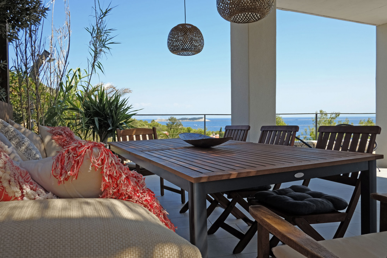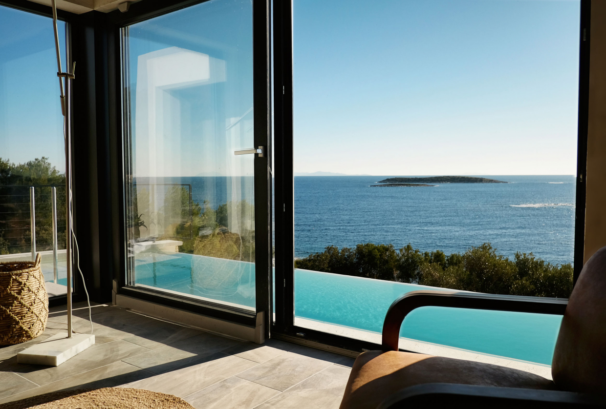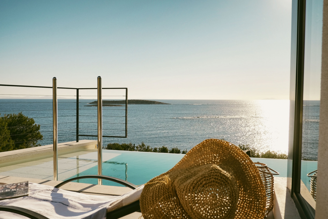 Das Haus verfügt über eine geräumige Terrasse und einen Infinity-Pool, von dem aus Sie das Meer sehen und romantische Sonnenuntergänge genießen können, und Ihr Aufenthalt hier wird Ihnen das Gefühl geben, auf der Adria zu segeln!