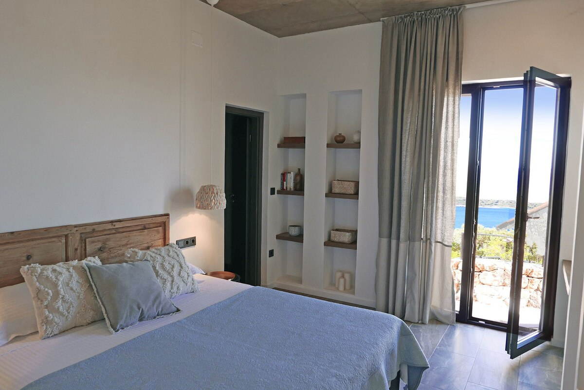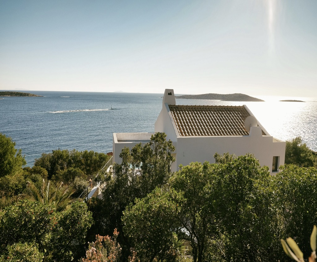 Ganz in Weiß gehalten und mit Steindetails verziert, die das blaue Meer im Hintergrund ergänzen, hat diese zweistöckige Villa mit sechs Zimmern eine Gesamtfläche von 180 m2 und liegt auf einem Grundstück von 404 m2.