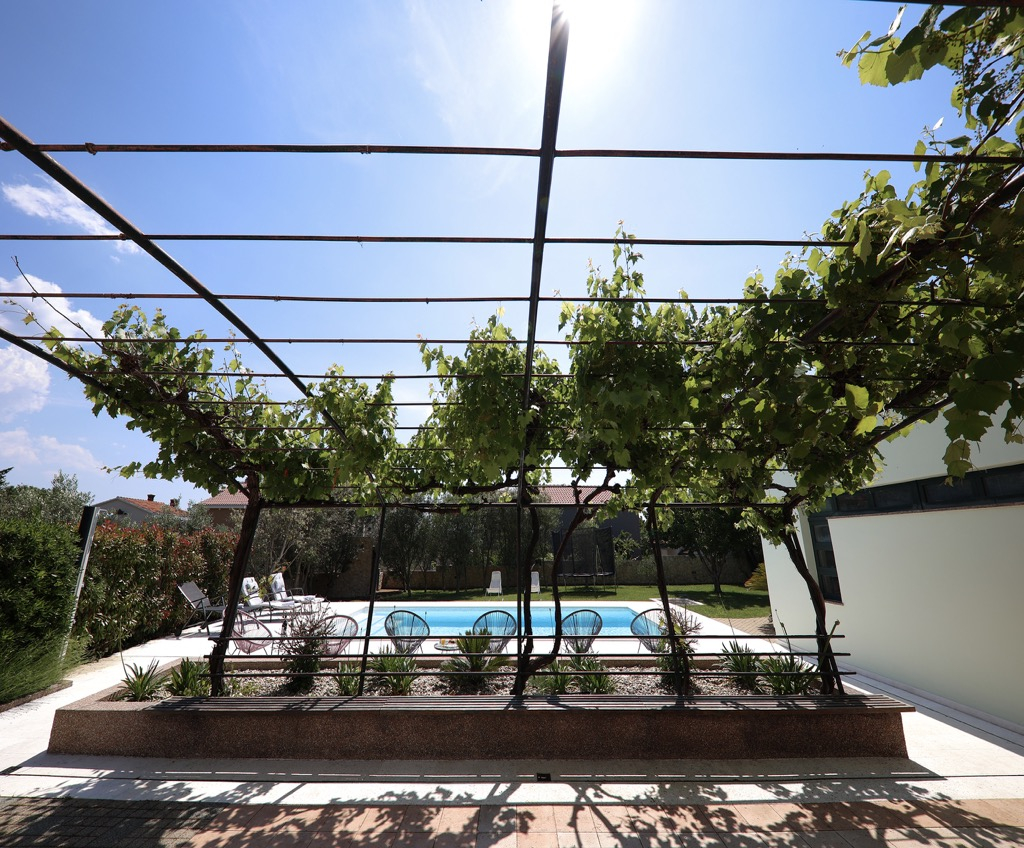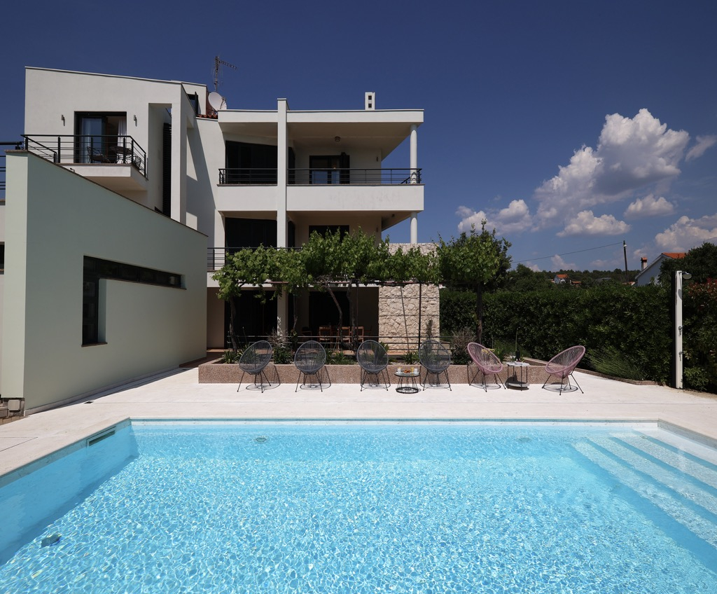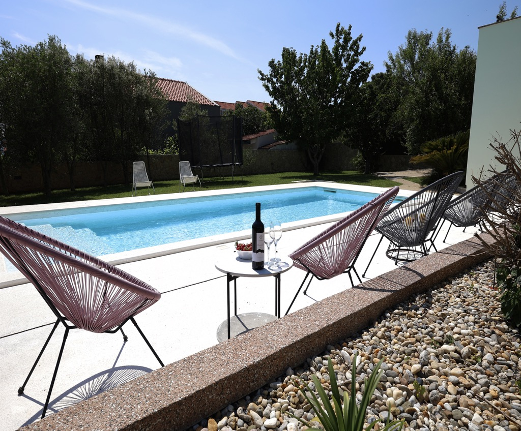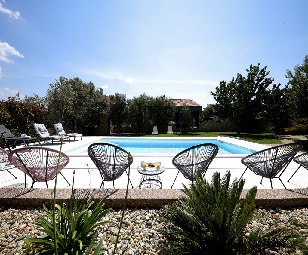Von der geräumigen Terrasse aus haben Sie Zugang zu einem großen Swimmingpool und zu einem kleinen Gartenbereich.