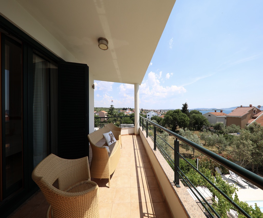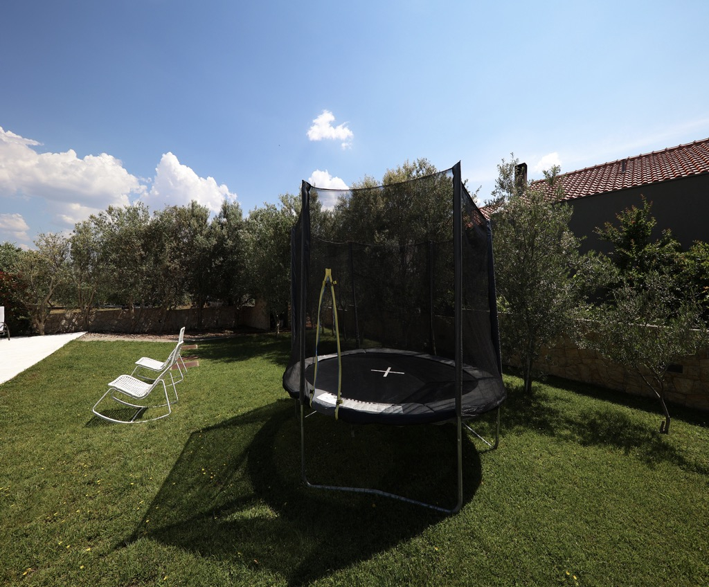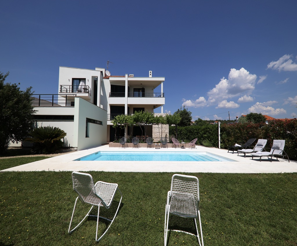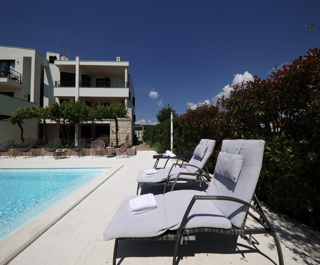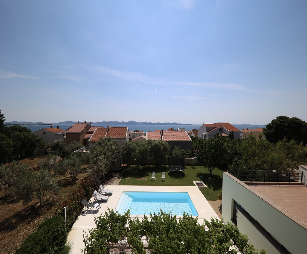 Von der geräumigen Terrasse aus haben Sie Zugang zu einem großen Swimmingpool und zu einem kleinen Gartenbereich.