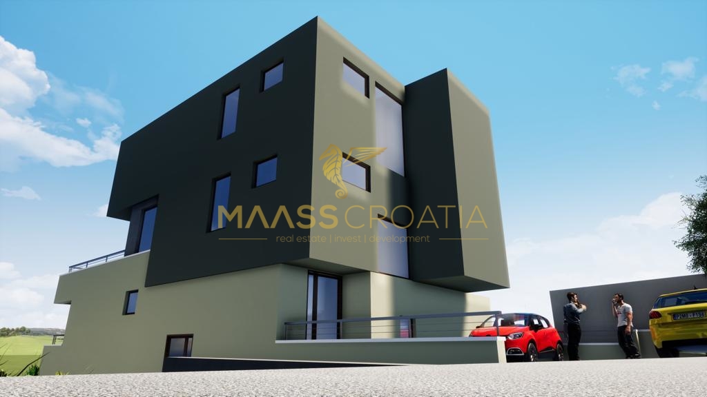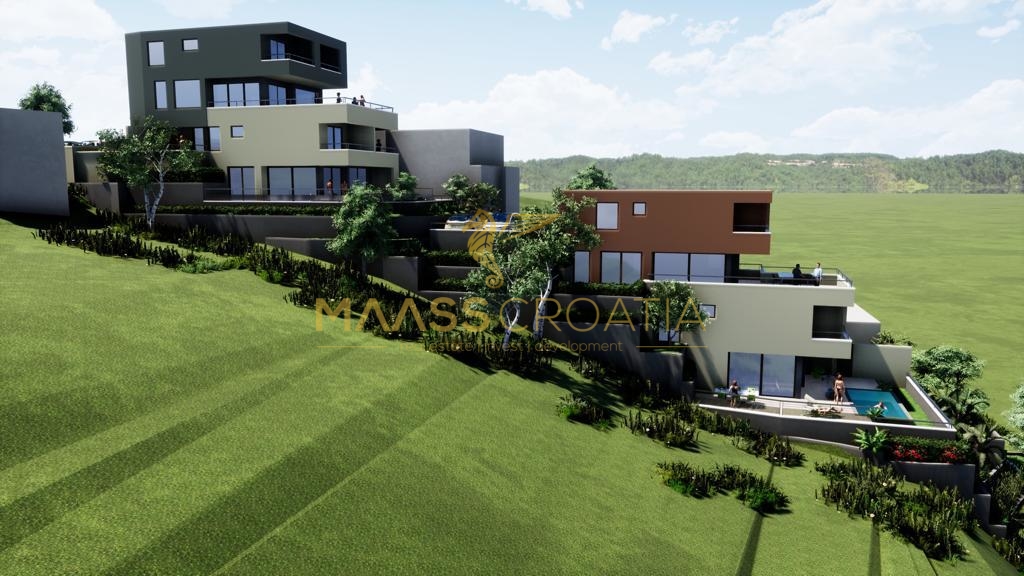 In Hanglage mit Meerblick, über Makarska, entsteht dieser Neubau mit zwei versetzten Doppelhaushälften.